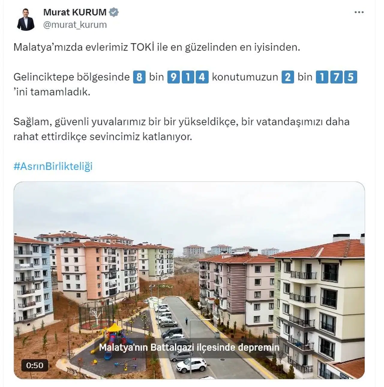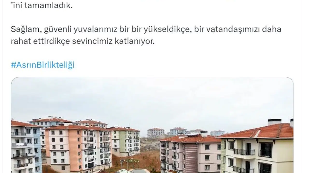 ANKARA, (DHA)-ÇEVRE, Şehircilik ve İklim Değişikliği Bakanı Murat Kurum, Kahramanmaraş merkezli depremlerden etkilenen Malatya'nın Gelinciktepe bölgesinde inşa edilen konutlardan 2 bin 175'inin tamamlandığını duyurdu.