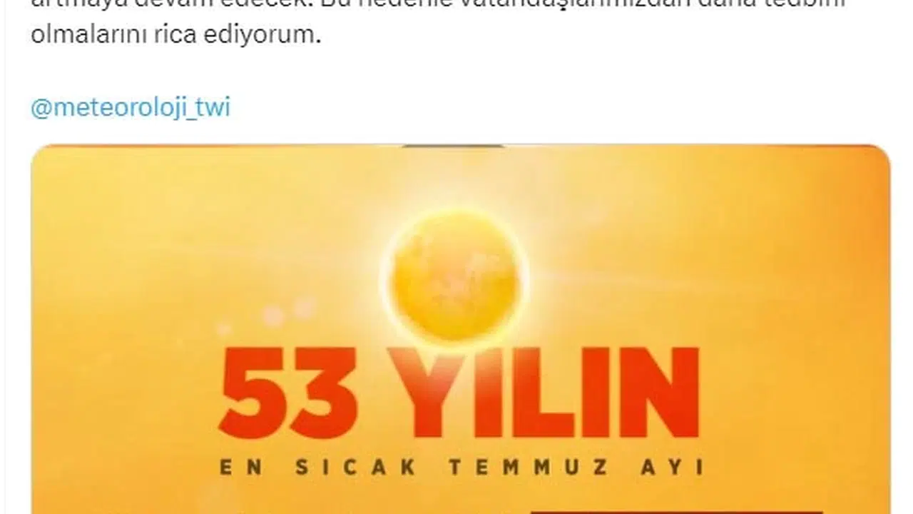 ANKARA, (DHA)- ÇEVRE, Şehircilik ve İklim Değişikliği Bakanı Murat Kurum, Meteoroloji Genel Müdürlüğü verilerine göre son 53 yılın en sıcak temmuz ayının yaşandığını söyledi.