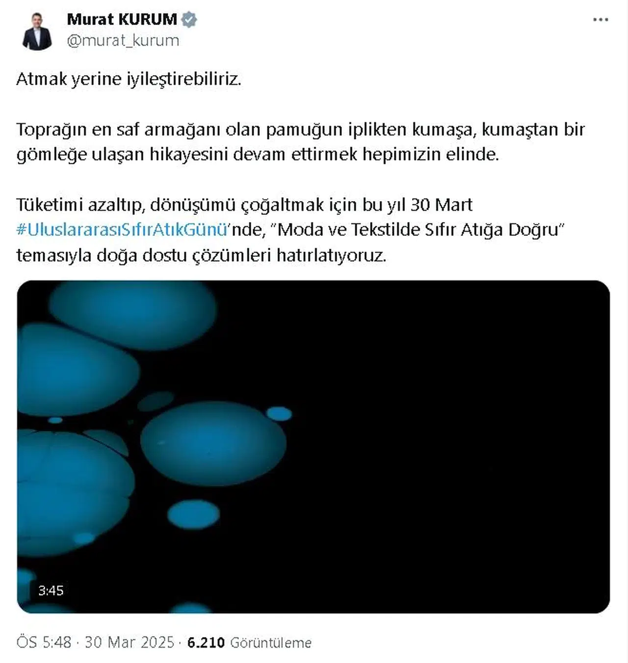ANKARA, (DHA)- ÇEVRE, Şehircilik ve İklim Değişikliği Bakanı Murat Kurum, 30 Mart Uluslararası Sıfır Atık Günü’nde 'Moda ve Tekstilde Sıfır Atığa Doğru' temalı klip paylaştı.