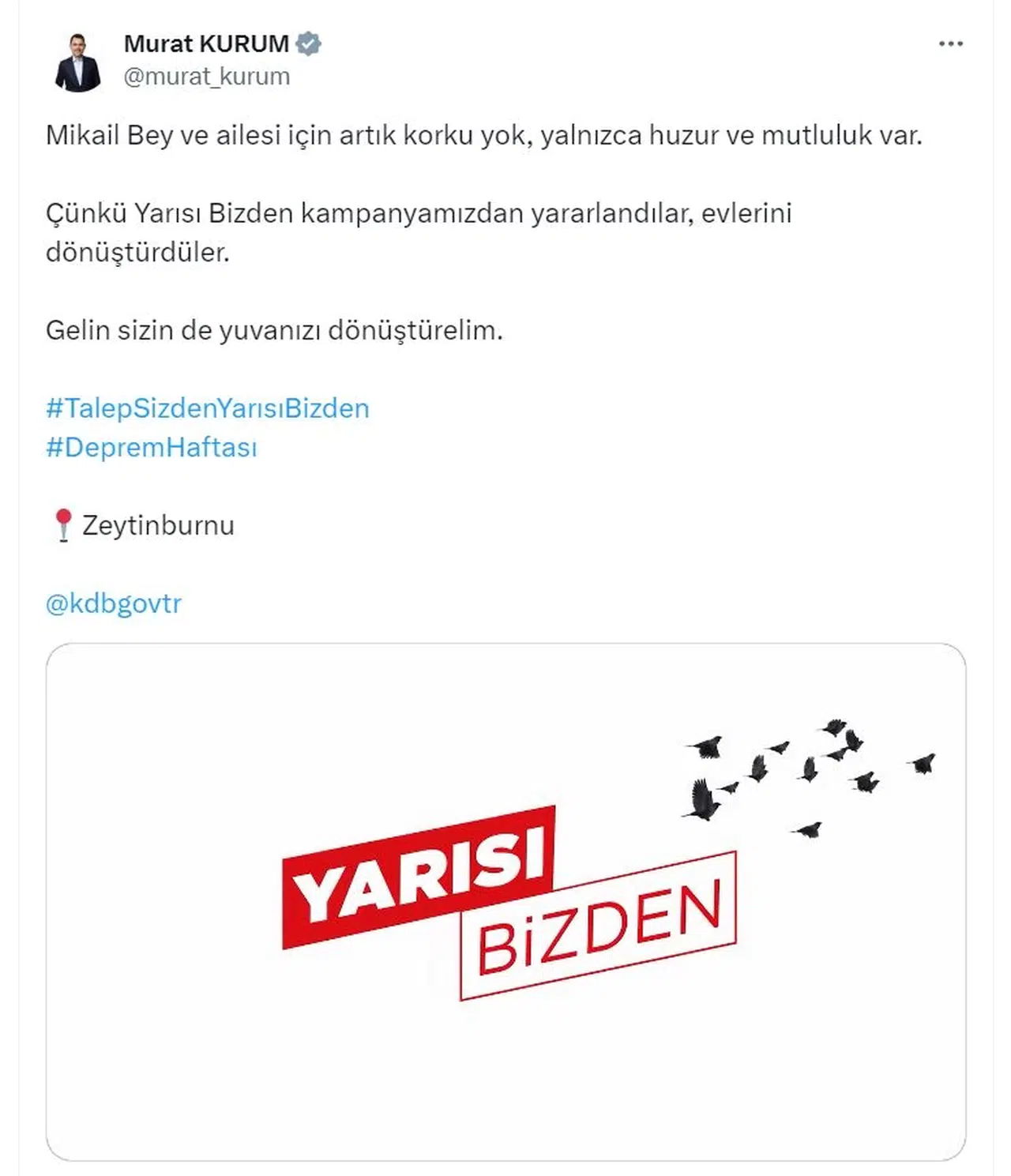 ANKARA, (DHA)- ÇEVRE, Şehircilik ve İklim Değişikliği Bakanı Murat Kurum, İstanbul'un kentsel dönüşümü için başlatılan Yarısı Bizden Kampanyası'na ilişkin, "Mikail Bey ve ailesi için artık korku yok, yalnızca huzur ve mutluluk var. Çünkü Yarısı Bizden kampanyamızdan yararlandılar, evlerini dönüştürdüler. Gelin sizin de yuvanızı dönüştürelim" dedi.