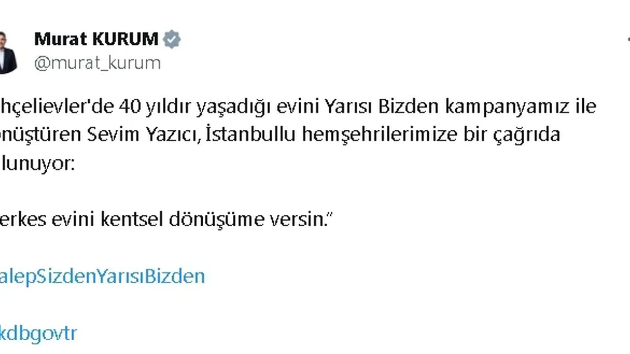 Çevre, Şehircilik ve İklim Değişikliği Bakanlığı'na bağlı Kentsel Dönüşüm Başkanlığı’nın koordinesiyle 2023 yılında başlatılan ve İstanbul’un tüm ilçelerini kapsayan 'Yarısı Bizden' kampanyası ile riskli yapıların dönüşümü devam ediyor. Çevre, Şehircilik ve İklim Değişikliği Bakanı Murat Kurum, Bahçelievler’de Yarısı Bizden kampanyasından yararlanarak evini dönüştüren emekli Sevim Yazıcı’nın hikayesini sosyal medya hesabından paylaştı. Bakan Kurum, "Bahçelievler'de 40 yıldır yaşadığı evini Yarısı Bizden kampanyamız ile dönüştüren Sevim Yazıcı, İstanbullu hemşehrilerimize bir çağrıda bulunuyor: 'Herkes evini kentsel dönüşüme versin'" ifadelerini kulandı.