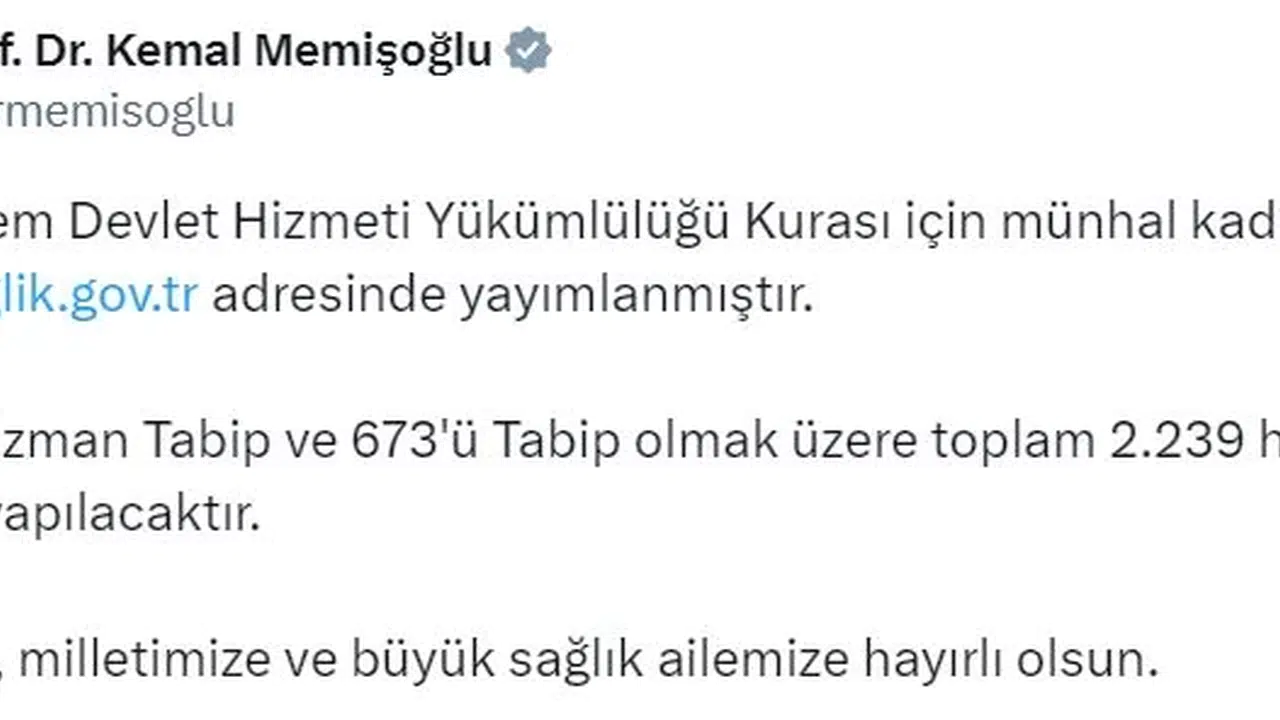 Bakan Memişoğlu, sosyal medya hesabından yaptığı açıklamada, "122'nci Dönem Devlet Hizmeti Yükümlülüğü Kurası için münhal kadrolar 'http://yhgm.saglik.gov.tr' adresinde yayımlanmıştır. 1566'sı uzman tabip ve 673'ü tabip olmak üzere toplam 2 bin 239 hekim ataması yapılacaktır. Ülkemize, milletimize ve büyük sağlık ailemize hayırlı olsun" ifadelerini kullandı. (DHA)