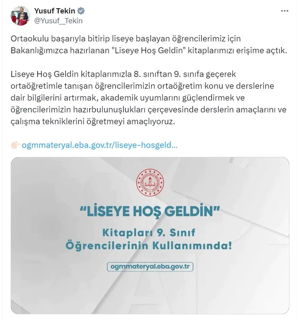 ANKARA, (DHA)- MİLLİ Eğitim Bakanı Yusuf Tekin, liseye başlayan öğrenciler için hazırlanan 'Liseye Hoş Geldin' kitaplarının erişime açıldığını duyurdu.