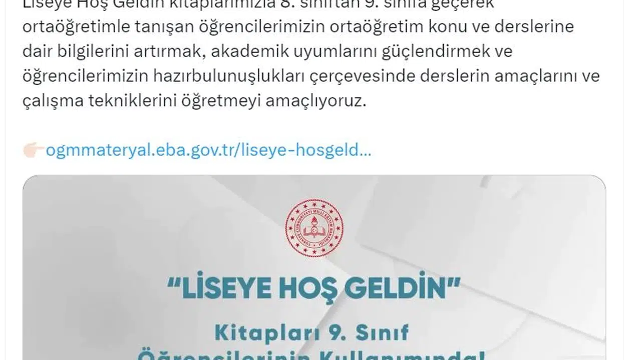 Milli Eğitim Bakanı Yusuf Tekin, sosyal medya hesabından yaptığı açıklamada, "Ortaokulu başarıyla bitirip liseye başlayan öğrencilerimiz için Bakanlığımızca hazırlanan 'Liseye Hoş Geldin' kitaplarımızı erişime açtık. Liseye Hoş Geldin kitaplarımızla 8'inci sınıftan 9'uncu sınıfa geçerek ortaöğretimle tanışan öğrencilerimizin ortaöğretim konu ve derslerine dair bilgilerini artırmak, akademik uyumlarını güçlendirmek ve öğrencilerimizin hazırbulunuşlukları çerçevesinde derslerin amaçlarını ve çalışma tekniklerini öğretmeyi amaçlıyoruz" ifadelerini kullandı. (DHA)