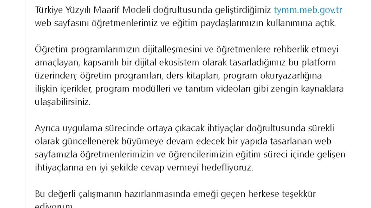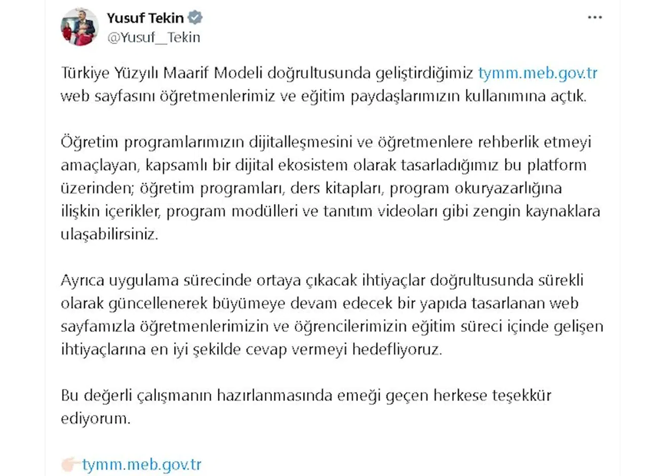 Bakan Yusuf Tekin, sosyal medya hesabından yaptığı açıklamada, "Türkiye Yüzyılı Maarif Modeli doğrultusunda geliştirdiğimiz http://tymm.meb.gov.tr web sayfasını öğretmenlerimiz ve eğitim paydaşlarımızın kullanımına açtık. Öğretim programlarımızın dijitalleşmesini ve öğretmenlere rehberlik etmeyi amaçlayan, kapsamlı bir dijital ekosistem olarak tasarladığımız bu platform üzerinden; öğretim programları, ders kitapları, program okuryazarlığına ilişkin içerikler, program modülleri ve tanıtım videoları gibi zengin kaynaklara ulaşabilirsiniz. Ayrıca uygulama sürecinde ortaya çıkacak ihtiyaçlar doğrultusunda sürekli olarak güncellenerek büyümeye devam edecek bir yapıda tasarlanan web sayfamızla öğretmenlerimizin ve öğrencilerimizin eğitim süreci içinde gelişen ihtiyaçlarına en iyi şekilde cevap vermeyi hedefliyoruz. Bu değerli çalışmanın hazırlanmasında emeği geçen herkese teşekkür ediyorum" ifadelerini kullandı. (DHA)