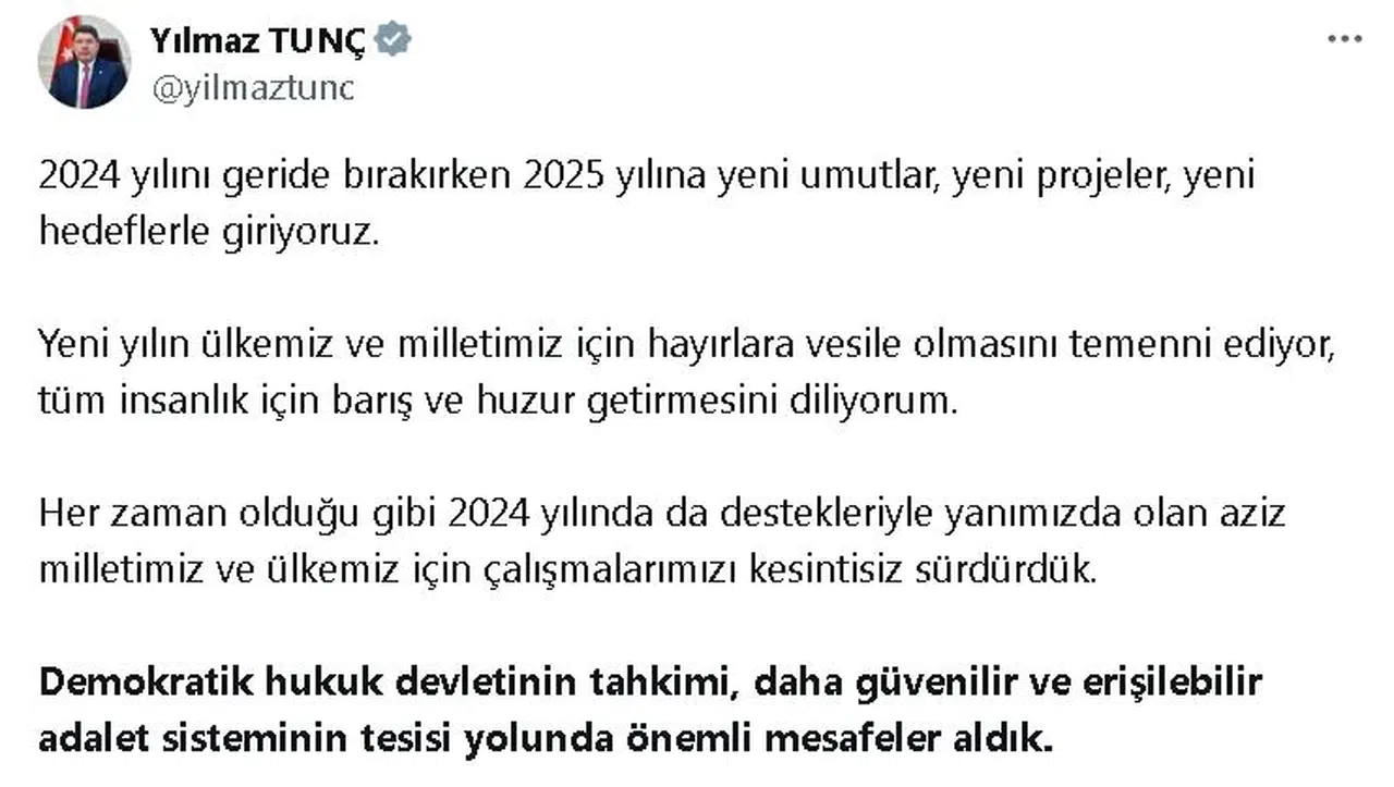 ANKARA, (DHA)- ADALET Bakanı Yılmaz Tunç, "2025 yılında ülkemizin kalkınması, milletimizin refahı, daha büyük ve güçlü Türkiye için çalışmalarımızı kesintisiz sürdüreceğiz. Hukukun üstünlüğünü koruyacak, adalete olan güveni daha da artıracak, temel hak ve özgürlükler ile insan onurunu en üst seviyede tesis edecek önemli düzenlemeleri hayata geçirmeye devam edeceğiz, 'Türkiye Yüzyılı'nı 'Adaletin Yüzyılı' yapacağız" dedi.