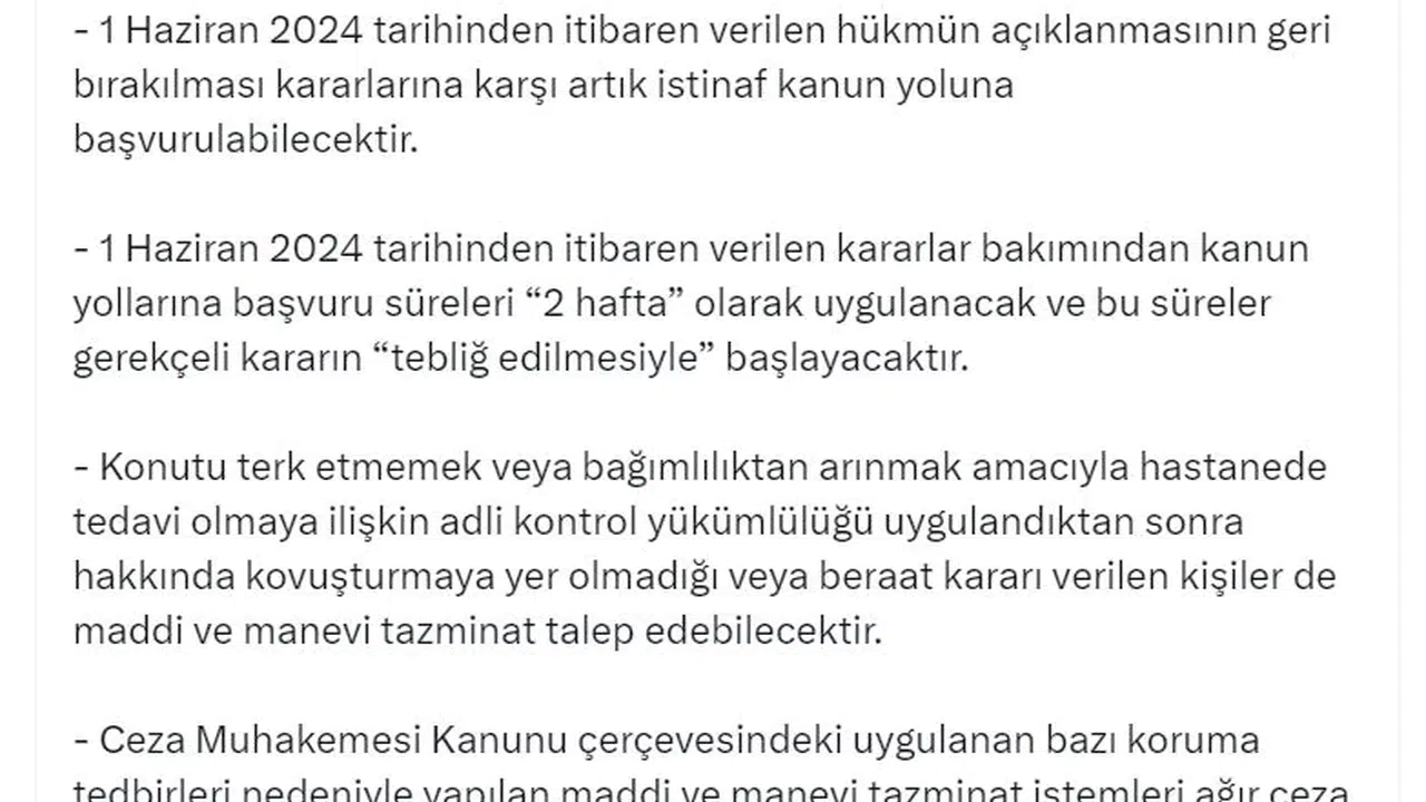 Bakan Tunç, sosyal medya hesabından yaptığı açıklamada, 2 Mart 2024 tarihli ve 7499 sayılı Ceza Muhakemesi Kanunu ile Bazı Kanunlarda Değişiklik Yapılmasına Dair Kanunla düzenlenen ve 1 Haziran 2024 tarihinde yürürlüğe giren hükümleri duyurdu. Tunç, 1 Haziran 2024 tarihinden itibaren verilen hükmün açıklanmasının geri bırakılması kararlarına karşı artık istinaf kanun yoluna başvurulabileceğini belirterek, "1 Haziran 2024 tarihinden itibaren verilen kararlar bakımından kanun yollarına başvuru süreleri '2 hafta' olarak uygulanacak ve bu süreler gerekçeli kararın 'tebliğ edilmesiyle' başlayacaktır. Konutu terk etmemek veya bağımlılıktan arınmak amacıyla hastanede tedavi olmaya ilişkin adli kontrol yükümlülüğü uygulandıktan sonra hakkında kovuşturmaya yer olmadığı veya beraat kararı verilen kişiler de maddi ve manevi tazminat talep edebilecektir. Ceza Muhakemesi Kanunu çerçevesindeki uygulanan bazı koruma tedbirleri nedeniyle yapılan maddi ve manevi tazminat istemleri ağır ceza mahkemeleri yerine Tazminat Komisyonuna yapılacaktır. Asliye ceza mahkemelerinde uygulanan basit yargılama usulünde, verilen mahkeme kararlarına itiraz edilmesi halinde yargılamayı yapacak hakimin belirlenme usulündeki değişiklikler de 1 Haziran 2024 tarihinden itibaren uygulanacaktır" dedi.