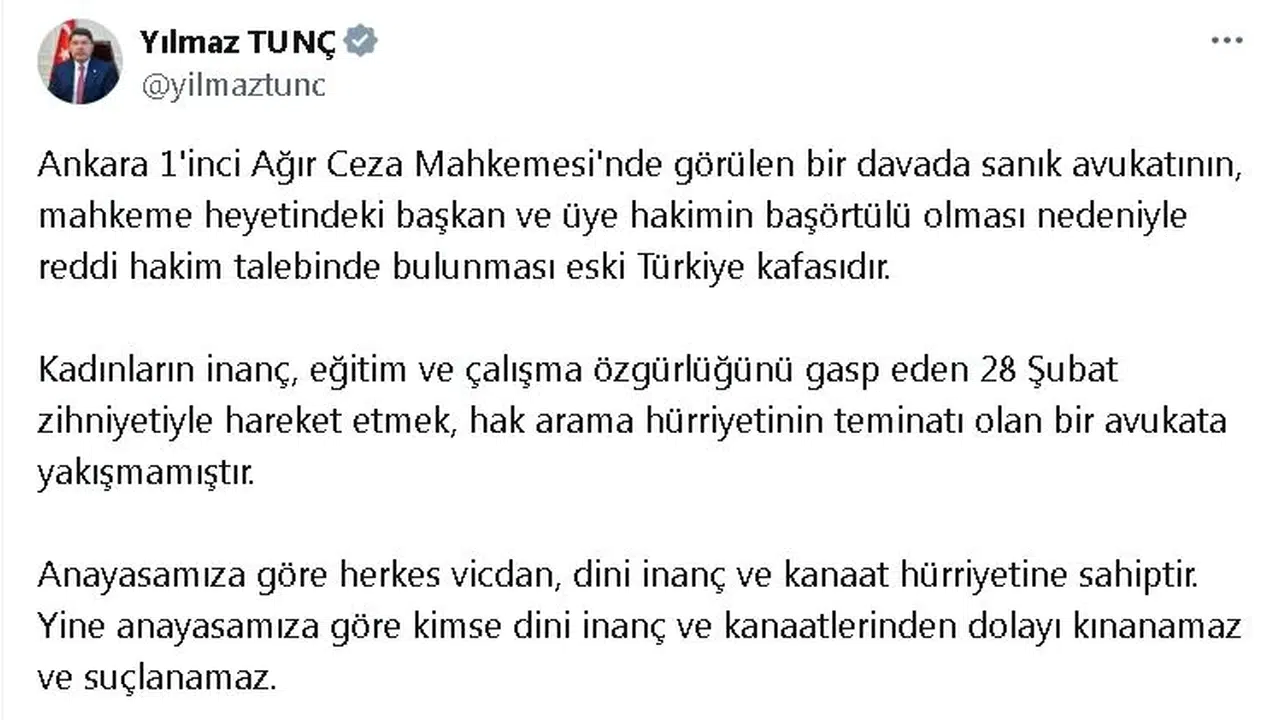 Bakan Tunç, sosyal medya hesabından yaptığı açıklamada, "Ankara 1'inci Ağır Ceza Mahkemesi'nde görülen bir davada sanık avukatının, mahkeme heyetindeki başkan ve üye hakimin başörtülü olması nedeniyle 'Reddi hakim' talebinde bulunması eski Türkiye kafasıdır. Kadınların inanç, eğitim ve çalışma özgürlüğünü gasbeden 28 Şubat zihniyetiyle hareket etmek, hak arama hürriyetinin teminatı olan bir avukata yakışmamıştır. Anayasamıza göre herkes vicdan, dini inanç ve kanaat hürriyetine sahiptir. Yine Anayasamıza göre kimse dini inanç ve kanaatlerinden dolayı kınanamaz ve suçlanamaz" ifadelerini kullandı.