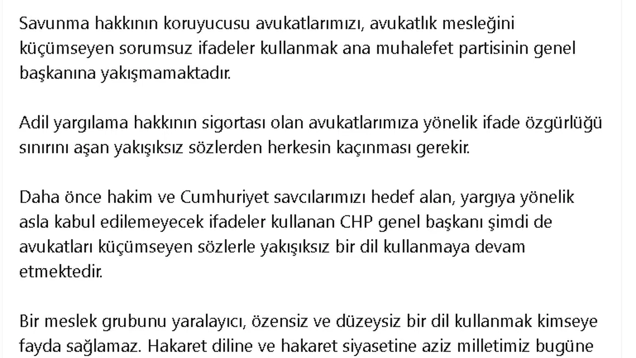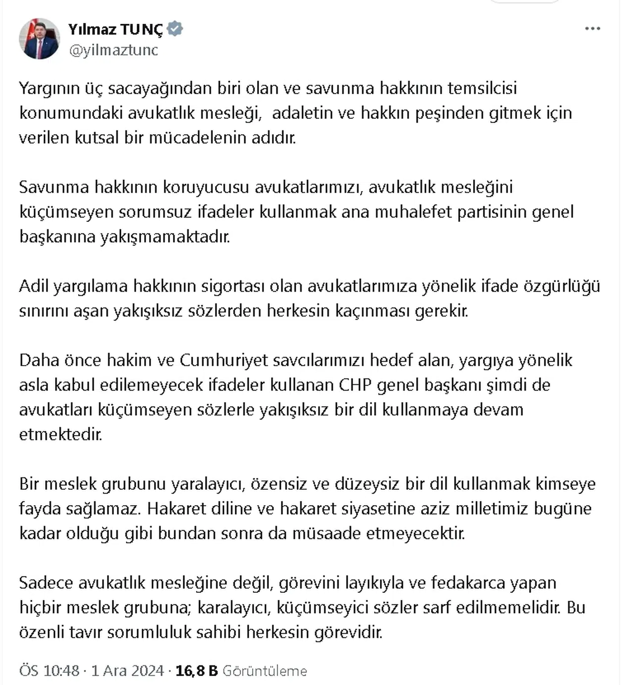 Bakan Tunç: CHP genel başkanı, avukatları küçümseyen sözlerle yakışıksız bir dil kullanmaya devam etmektedir