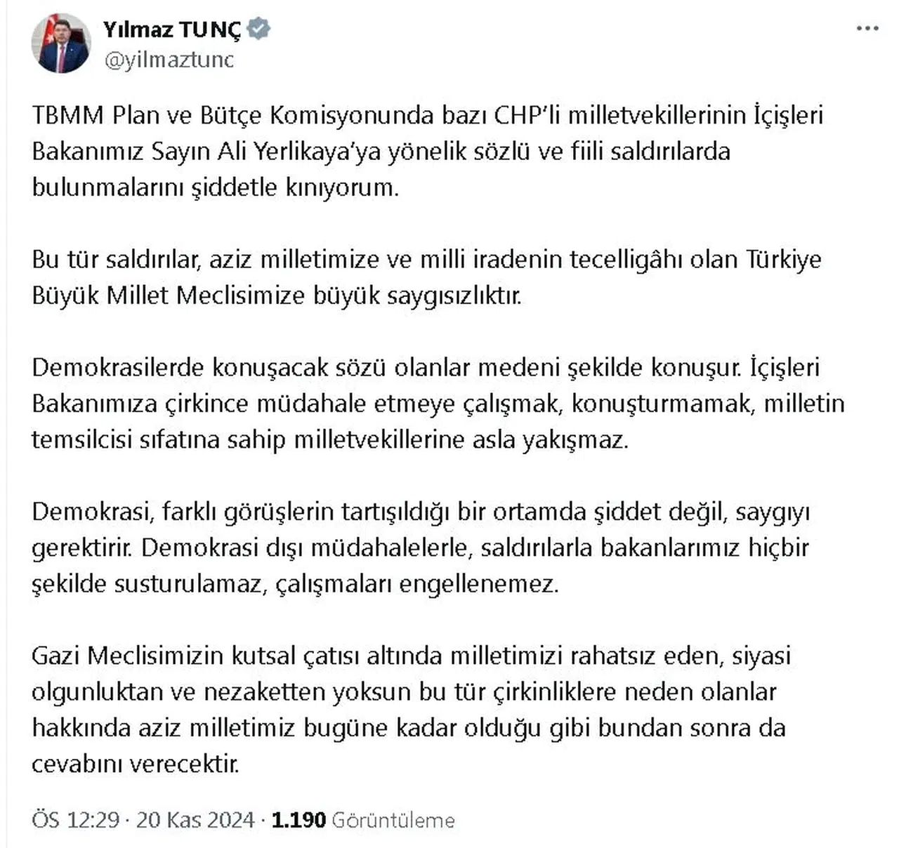 Bakan Tunç, sosyal medya hesabından yaptığı açıklamada, "TBMM Plan ve Bütçe Komisyonu'nda bazı CHP'li milletvekillerinin İçişleri Bakanımız Sayın Ali Yerlikaya'ya yönelik sözlü ve fiili saldırılarda bulunmalarını şiddetle kınıyorum. Bu tür saldırılar, aziz milletimize ve milli iradenin tecelligahı olan TBMM'ye büyük saygısızlıktır. Demokrasilerde konuşacak sözü olanlar medeni şekilde konuşur. İçişleri Bakanımıza çirkince müdahale etmeye çalışmak, konuşturmamak, milletin temsilcisi sıfatına sahip milletvekillerine asla yakışmaz" ifadelerini kullandı.