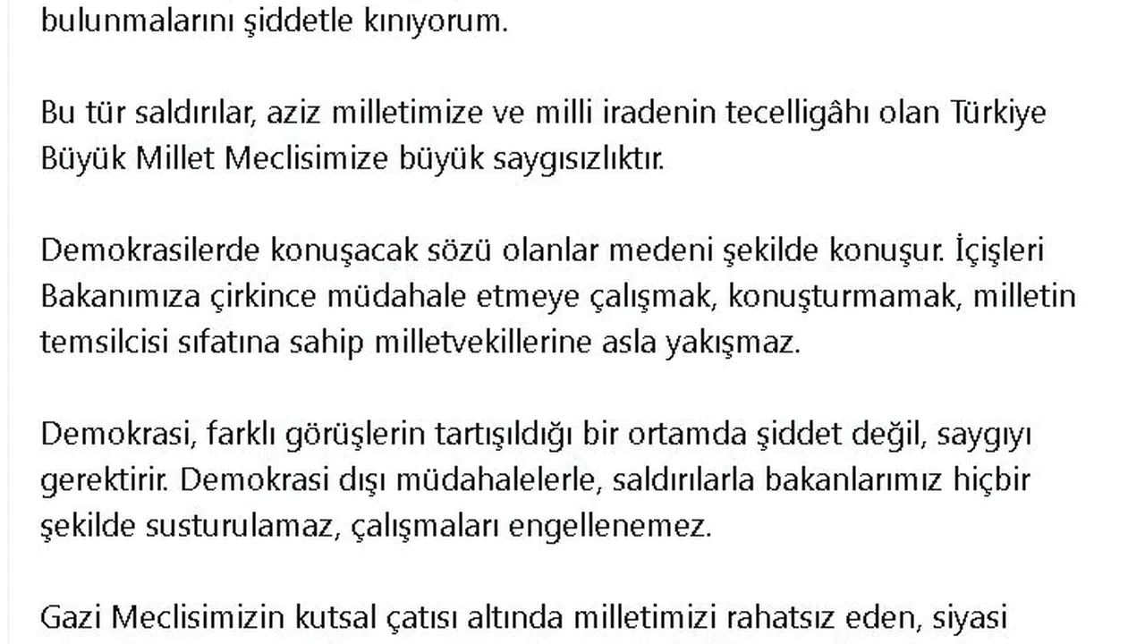 Demokrasinin, farklı görüşlerin tartışıldığı bir ortamda şiddet değil, saygıyı gerektirdiğini aktaran Tunç, "Demokrasi dışı müdahalelerle, saldırılarla bakanlarımız hiçbir şekilde susturulamaz, çalışmaları engellenemez. Gazi Meclisimizin kutsal çatısı altında milletimizi rahatsız eden, siyasi olgunluktan ve nezaketten yoksun bu tür çirkinliklere neden olanlar hakkında aziz milletimiz bugüne kadar olduğu gibi bundan sonra da cevabını verecektir" açıklamasında bulundu. (DHA)
