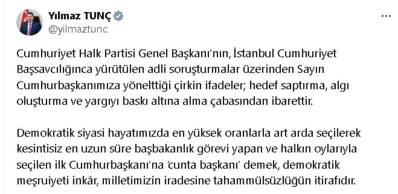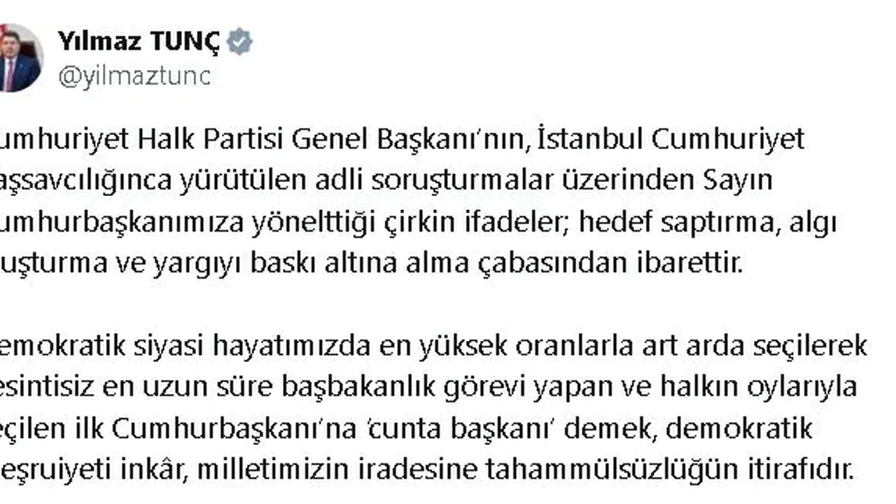 Adalet Bakanı Yılmaz Tunç, sosyal medya hesabından yaptığı açıklamada, "Cumhuriyet Halk Partisi Genel Başkanının, İstanbul Cumhuriyet Başsavcılığınca yürütülen adli soruşturmalar üzerinden Sayın Cumhurbaşkanımıza yönelttiği çirkin ifadeler; hedef saptırma, algı oluşturma ve yargıyı baskı altına alma çabasından ibarettir. Demokratik siyasi hayatımızda en yüksek oranlarla art arda seçilerek kesintisiz en uzun süre başbakanlık görevi yapan ve halkın oylarıyla seçilen ilk Cumhurbaşkanı'na 'cunta başkanı' demek, demokratik meşruiyeti inkar, milletimizin iradesine tahammülsüzlüğün itirafıdır. Vesayet düzeniyle kol kola yürüyen, darbe dönemlerinin gölgesinde siyaset üreten Yassıada zihniyetini hafızalarına kazıyan aziz milletimiz, vesayetle mücadele edenle, onun gölgesinde büyüyeni ayırt edecek ferasete sahiptir" ifadelerini kullandı.