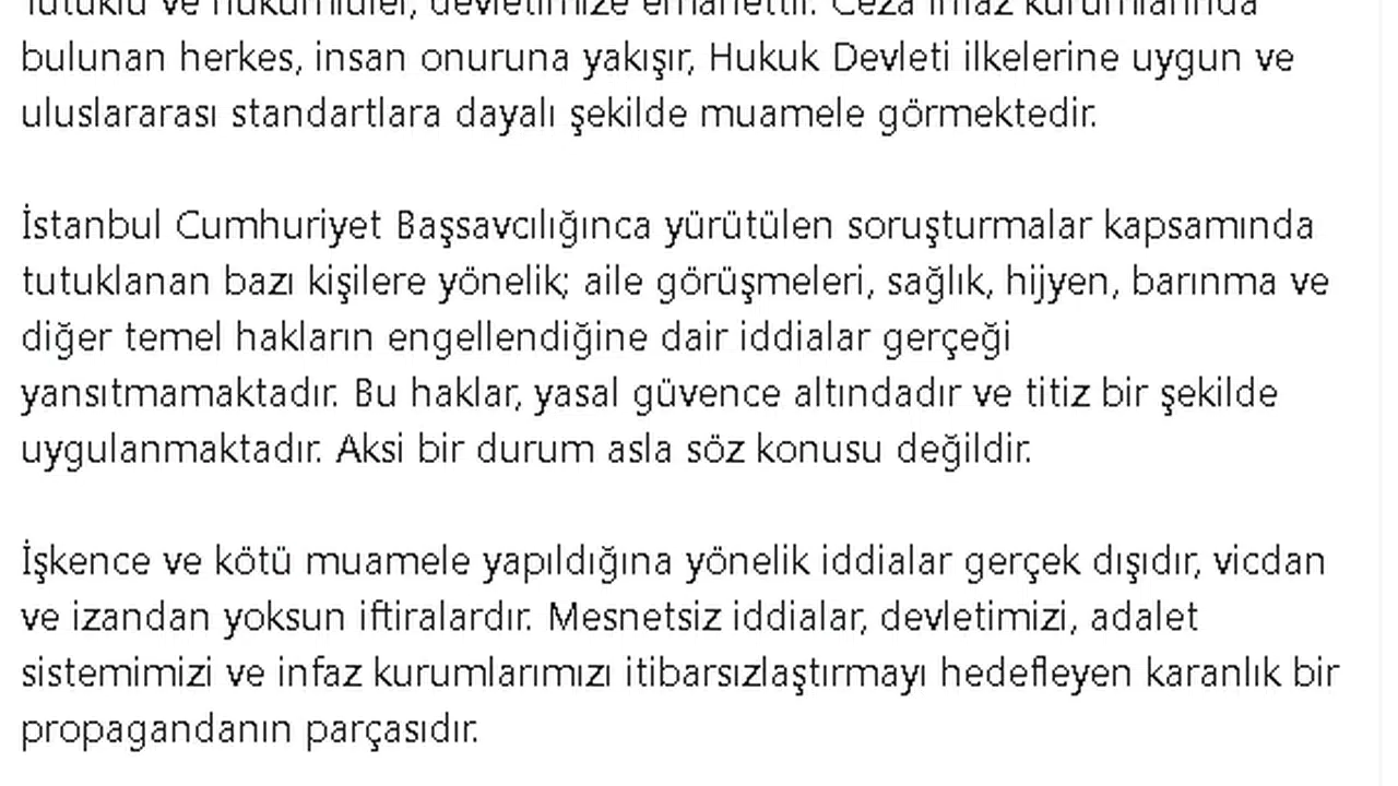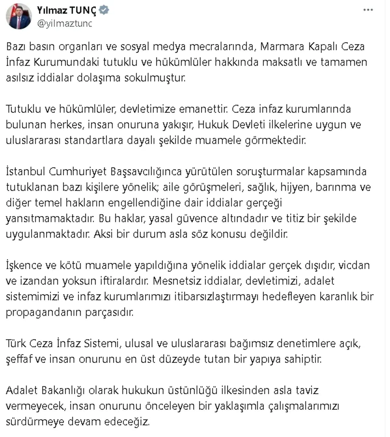 Bakan Tunç, sosyal medyadan yaptığı açıklamada, "Bazı basın organları ve sosyal medya mecralarında, Marmara Kapalı Ceza İnfaz Kurumundaki tutuklu ve hükümlüler hakkında maksatlı ve tamamen asılsız iddialar dolaşıma sokulmuştur. Tutuklu ve hükümlüler, devletimize emanettir. Ceza infaz kurumlarında bulunan herkes, insan onuruna yakışır, hukuk devleti ilkelerine uygun ve uluslararası standartlara dayalı şekilde muamele görmektedir. İstanbul Cumhuriyet Başsavcılığınca yürütülen soruşturmalar kapsamında tutuklanan bazı kişilere yönelik; aile görüşmeleri, sağlık, hijyen, barınma ve diğer temel hakların engellendiğine dair iddialar gerçeği yansıtmamaktadır. Bu haklar, yasal güvence altındadır ve titiz bir şekilde uygulanmaktadır. Aksi bir durum asla söz konusu değildir" dedi.