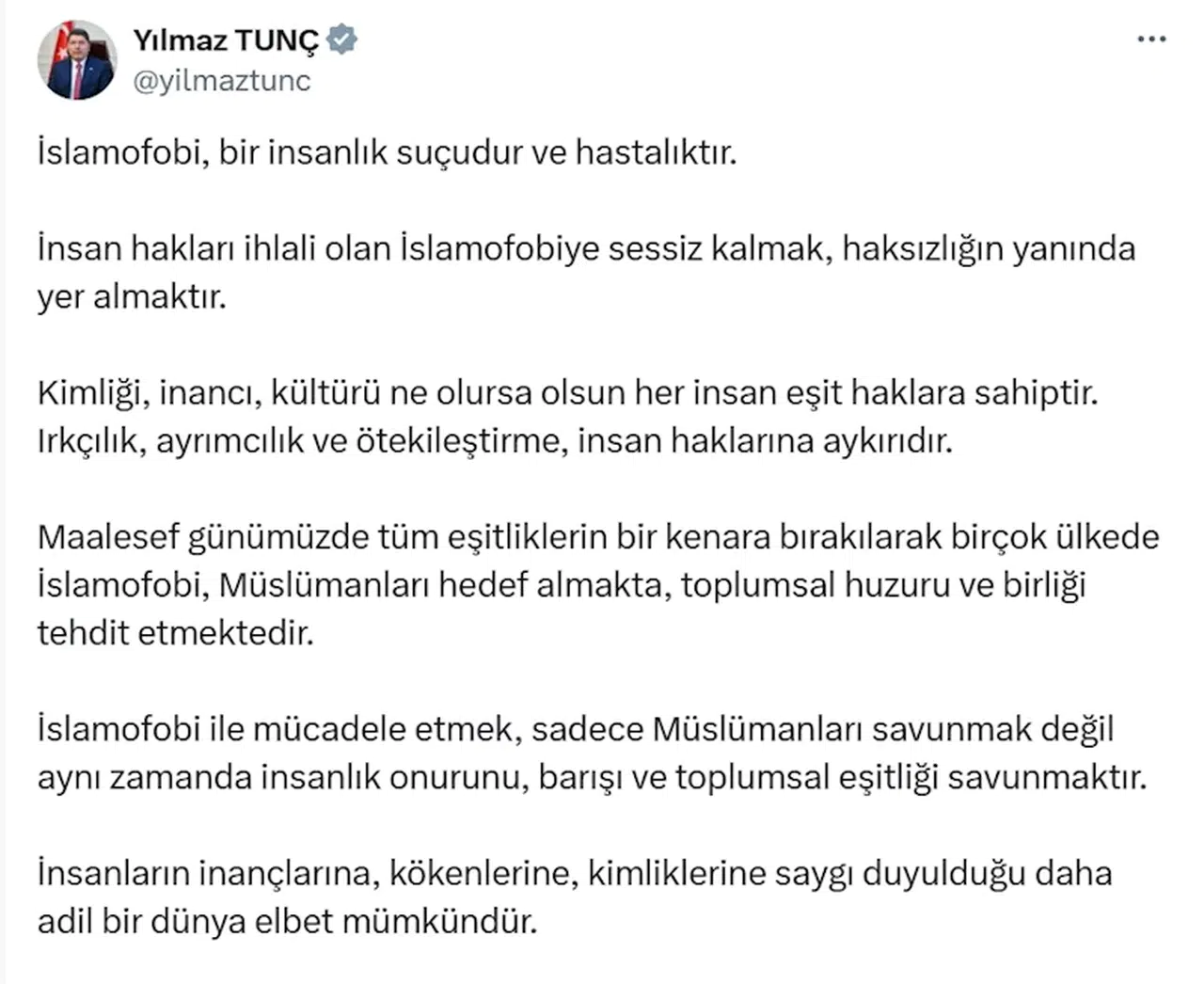 Eda KOÇ/ANKARA, (DHA)- ADALET Bakanı Yılmaz Tunç, “İslamofobi, bir insanlık suçudur ve hastalıktır. İnsan hakları ihlali olan İslamofobiye sessiz kalmak, haksızlığın yanında yer almaktır. Kimliği, inancı, kültürü ne olursa olsun her insan eşit haklara sahiptir. Irkçılık, ayrımcılık ve ötekileştirme, insan haklarına aykırıdır” dedi.