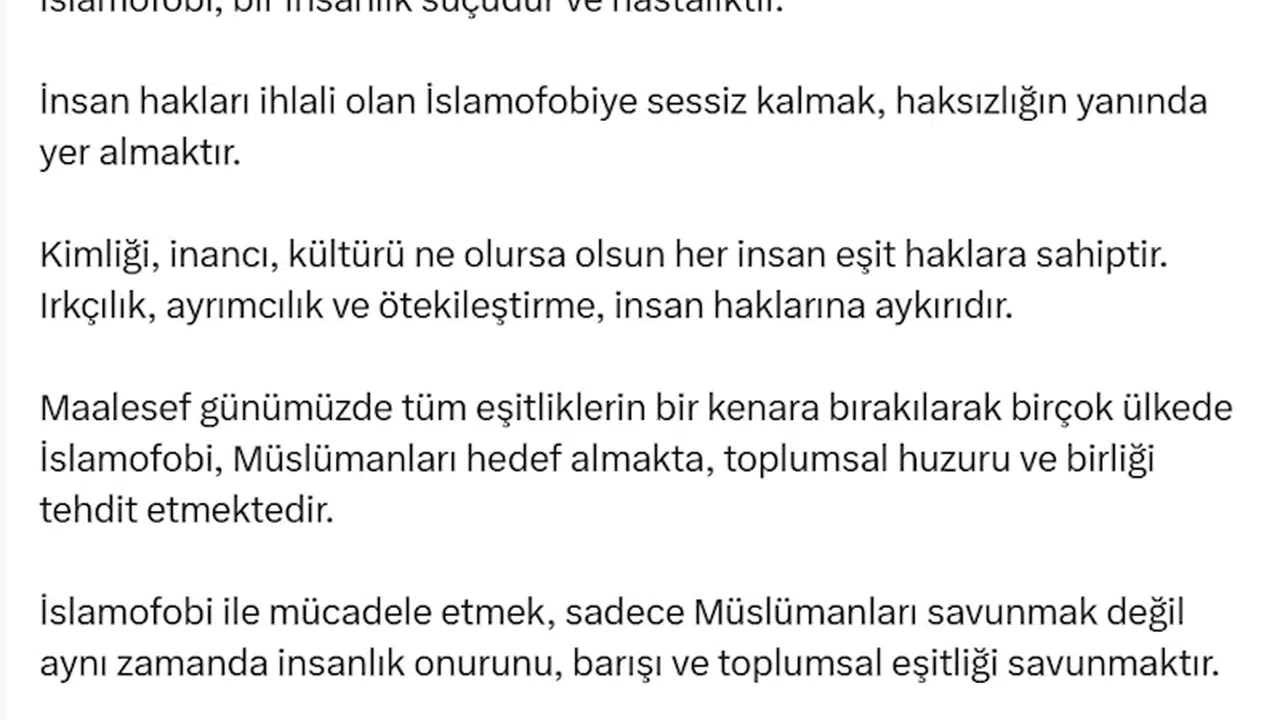 Adalet Bakanı Yılmaz Tunç, sosyal medya hesabından yaptığı açıklamada, “İslamofobi, bir insanlık suçudur ve hastalıktır. İnsan hakları ihlali olan İslamofobiye sessiz kalmak, haksızlığın yanında yer almaktır. Kimliği, inancı, kültürü ne olursa olsun her insan eşit haklara sahiptir. Irkçılık, ayrımcılık ve ötekileştirme, insan haklarına aykırıdır. Maalesef günümüzde tüm eşitliklerin bir kenara bırakılarak birçok ülkede İslamofobi, Müslümanları hedef almakta, toplumsal huzuru ve birliği tehdit etmektedir. İslamofobi ile mücadele etmek, sadece Müslümanları savunmak değil aynı zamanda insanlık onurunu, barışı ve toplumsal eşitliği savunmaktır. İnsanların inançlarına, kökenlerine, kimliklerine saygı duyulduğu daha adil bir dünya elbet mümkündür. Nerede olursa olsun haksızlığın karşısında hiçbir zaman susmayan Türkiye olarak bugüne kadar olduğu gibi bundan sonra da terörizm, ırkçılık, İslam karşıtlığı, yabancı düşmanlığı ve dünyada hakları ihlal edilen tüm mağdurlar için mücadelemize kararlılıkla devam edeceğiz" dedi. (DHA)