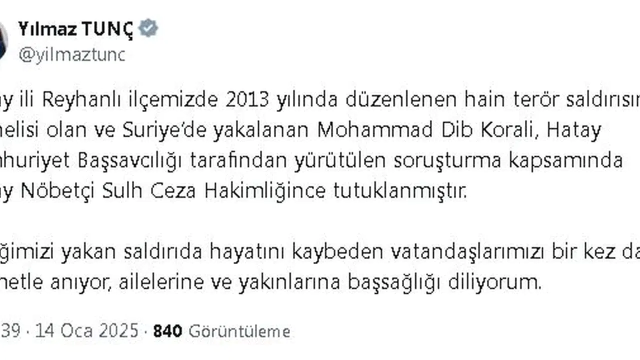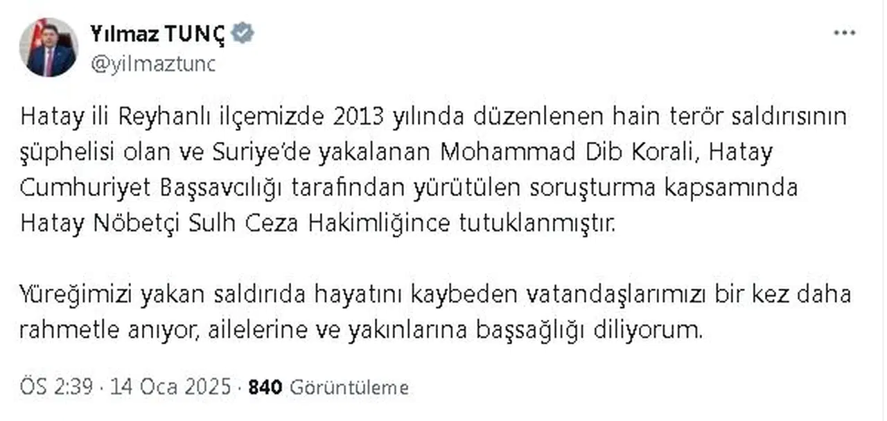 Bakan Yılmaz Tunç, sosyal medya hesabından yaptığı açıklamada, "Hatay ili Reyhanlı ilçemizde 2013 yılında düzenlenen hain terör saldırısının şüphelisi olan ve Suriye'de yakalanan Mohammad Dib Korali, Hatay Cumhuriyet Başsavcılığı tarafından yürütülen soruşturma kapsamında Hatay Nöbetçi Sulh Ceza Hakimliği'nce tutuklanmıştır. Yüreğimizi yakan saldırıda hayatını kaybeden vatandaşlarımızı bir kez daha rahmetle anıyor, ailelerine ve yakınlarına baş sağlığı diliyorum" ifadelerini kullandı. (DHA)