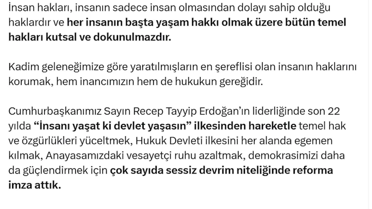 'Türkiye Yüzyılı'nın ilk temel politika belgelerinden olacak yeni Yargı Reformu Strateji Belgesi'nde de hukuk devletini daha da tahkim edecek, temel hak ve özgürlükleri daha da güçlendirecek adımlar atmaya devam edeceklerini vurgulayan Bakan Tunç, şunları kaydetti: "Huzurlu ve güvenli bir gelecek, daha adil bir dünya için şüphesiz insan hakları korunmalıdır. Ancak günümüzde başta Filistin olmak üzere birçok coğrafyada insan hakları ihlallerinin eriştiği boyut, insanlığın geleceği adına endişe vericidir. En temel insan hakları olan yaşam hakkı, mülkiyet hakkı, güvenlik hakkı, din ve vicdan özgürlüğü yok sayılmaktadır. Uluslararası kuruluşlar ve mekanizmalar insanlığın sorunlarını çözmekte yetersiz ve etkisiz kalmaktadır. Sözde demokrasi ve insan hakları savunucusu ülkeler, insan haklarının evrensel olma vasfını teoriden pratiğe geçirememiş, Filistin ve mazlum coğrafyalardaki sınavını geçememiştir. Türkiye olarak nerede olursa olsun yaşanan acılara ve hak ihlallerine karşı sesimizi yükseltmeyi, her zaman adaleti ve hakkaniyeti savunmayı sürdüreceğiz. Güçlünün değil haklının yanında olmaya devam edeceğiz. Acıların ve adaletsizliklerin yaşanmadığı, barışın ve insan onurunun egemen olduğu, insan haklarının güvence altına aldığı daha güzel bir dünya temennisiyle." (DHA)