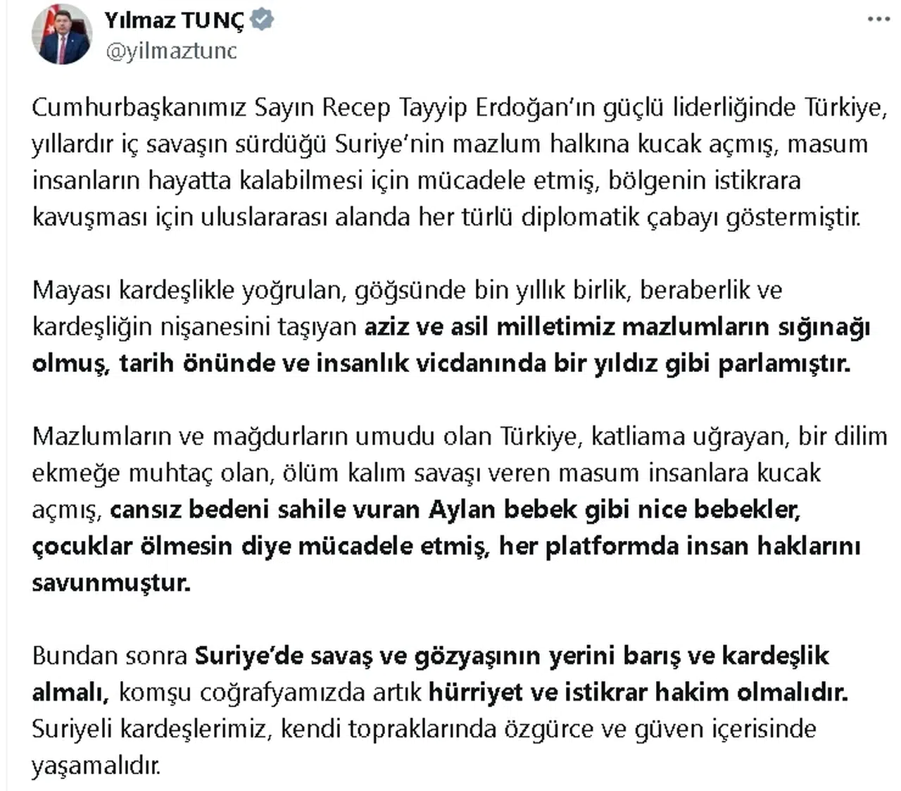 Umutcan ÖREN/ANKARA, (DHA)- ADALET Bakanı Yılmaz Tunç, "Suriye'de savaş ve gözyaşının yerini barış ve kardeşlik almalı, komşu coğrafyamızda artık hürriyet ve istikrar hakim olmalıdır. Suriyeli kardeşlerimiz, kendi topraklarında özgürce ve güven içerisinde yaşamalıdır" dedi.