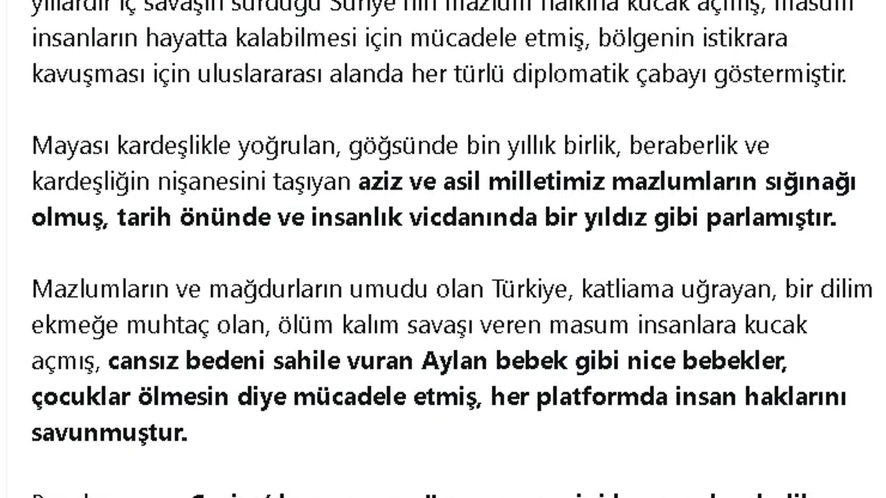 "Suriye'de oluşacak yeni yönetim, kimseyi ötekileştirmeden ülkenin milli birliği, toprak bütünlüğü, istikrarı ve halkının refahı için çalışmalıdır. Türkiye Cumhuriyeti, bugüne kadar komşularının toprak bütünlüğüne ve ulusal güvenliğine azami ihtiramı göstermiş olup bundan sonra da aynı politikayı büyük bir hassasiyetle takip edecektir. Diğer yandan ülkemizin güvenliği, milletimizin huzuru için terör örgütleriyle kararlı mücadelemiz kesintisiz şekilde devam edecektir. Suriye'nin ve tüm mazlum coğrafyaların geleceği ve güvenliği için, sulh için, kardeşlik için mücadelemizi sürdürecek; bugüne kadar olduğu gibi bundan sonra da daima haktan, hakkaniyetten, adaletten yana olacağız." (DHA)