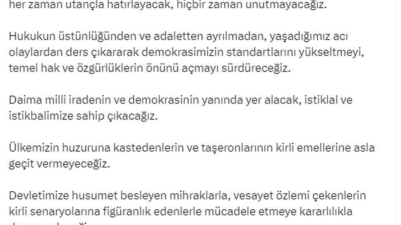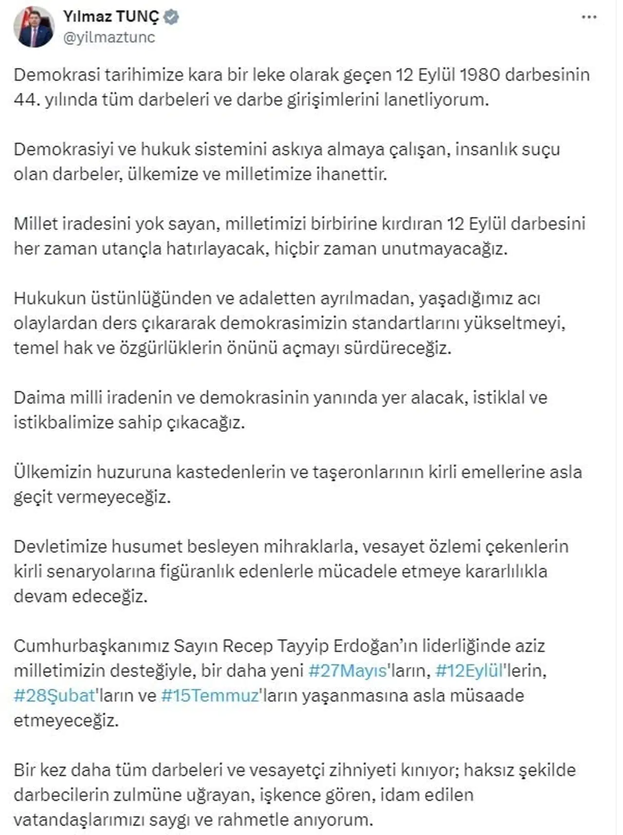 Bakan Tunç, sosyal medya hesabından 12 Eylül 1980 darbesinin yıl dönümü nedeniyle mesaj paylaştı. Tunç, "Demokrasiyi ve hukuk sistemini askıya almaya çalışan, insanlık suçu olan darbeler, ülkemize ve milletimize ihanettir. Millet iradesini yok sayan, milletimizi birbirine kırdıran 12 Eylül darbesini her zaman utançla hatırlayacak, hiçbir zaman unutmayacağız. Hukukun üstünlüğünden ve adaletten ayrılmadan, yaşadığımız acı olaylardan ders çıkararak demokrasimizin standartlarını yükseltmeyi, temel hak ve özgürlüklerin önünü açmayı sürdüreceğiz. Daima milli iradenin ve demokrasinin yanında yer alacak, istiklal ve istikbalimize sahip çıkacağız. Ülkemizin huzuruna kastedenlerin ve taşeronlarının kirli emellerine asla geçit vermeyeceğiz. Devletimize husumet besleyen mihraklarla, vesayet özlemi çekenlerin kirli senaryolarına figüranlık edenlerle mücadele etmeye kararlılıkla devam edeceğiz. Cumhurbaşkanımız Sayın Recep Tayyip Erdoğan’ın liderliğinde aziz milletimizin desteğiyle, bir daha yeni 27 Mayıs'ların, 12 Eylül'lerin, 28 Şubat'ların ve 15 Temmuz'ların yaşanmasına asla müsaade etmeyeceğiz. Bir kez daha tüm darbeleri ve vesayetçi zihniyeti kınıyor; haksız şekilde darbecilerin zulmüne uğrayan, işkence gören, idam edilen vatandaşlarımızı saygı ve rahmetle anıyorum" ifadelerini kullandı. (DHA)