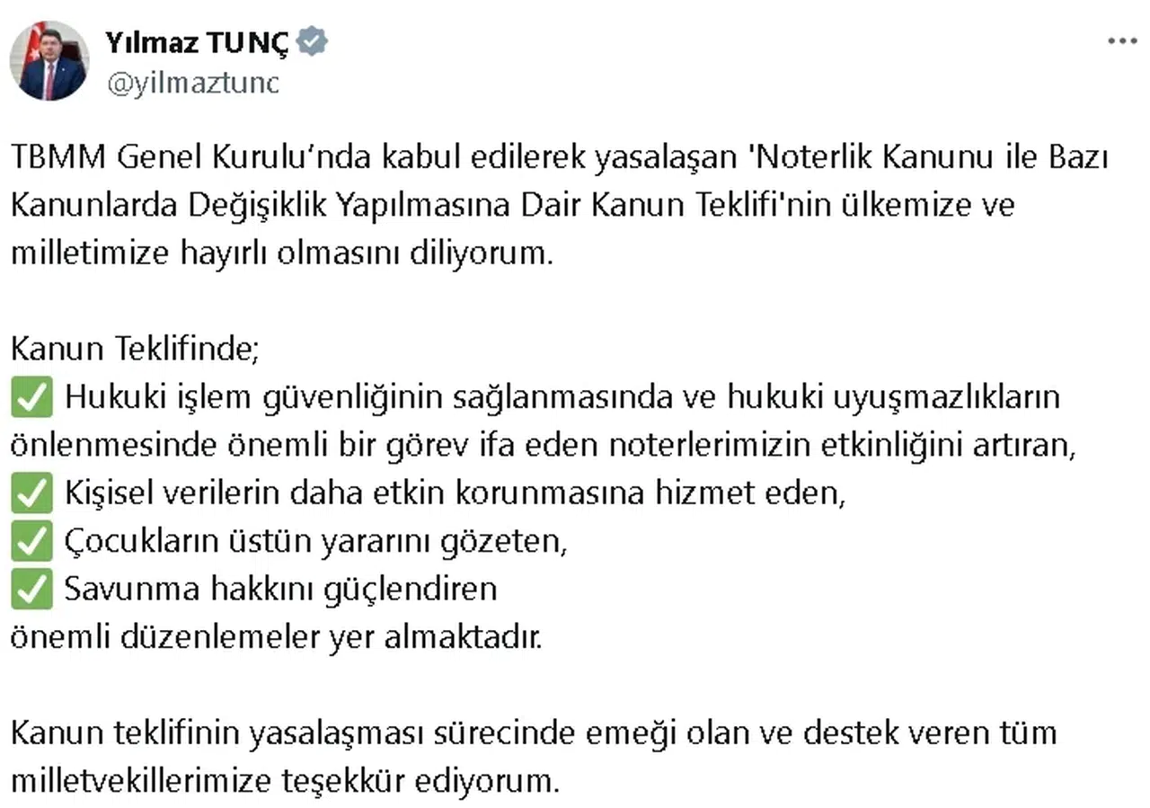 Bakan Tunç'dan, TBMM'de kabul edilerek yasalaşan 'Noterlik Kanun Teklifi' paylaşımı