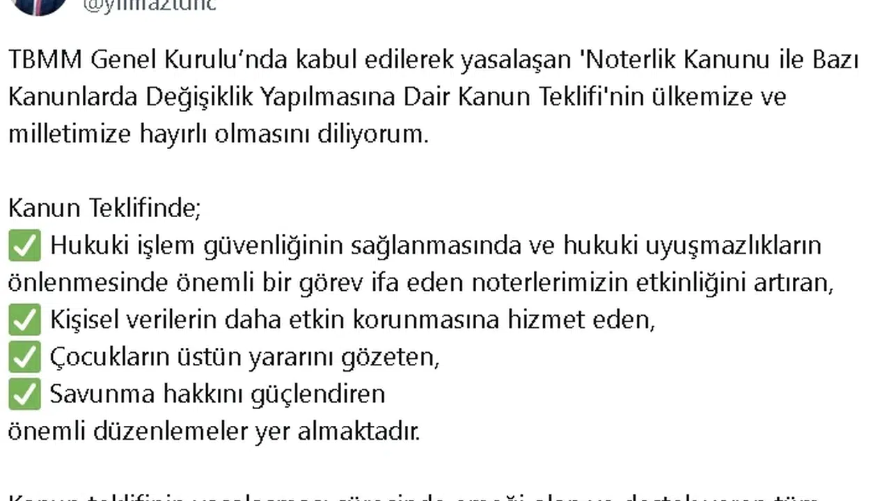 Bakan Tunç, sosyal medya hesabından yaptığı paylaşımda, kanun teklifi ile yapılan düzenlemeler hakkında bilgi verdi. Tunç, TBMM Genel Kurulu’nda kabul edilerek yasalaşan 'Noterlik Kanunu ile Bazı Kanunlarda Değişiklik Yapılmasına Dair Kanun Teklifi'nin ülkemize ve milletimize hayırlı olmasını diliyorum. Kanun Teklifinde; hukuki işlem güvenliğinin sağlanmasında ve hukuki uyuşmazlıkların önlenmesinde önemli bir görev ifa eden noterlerimizin etkinliğini artıran, kişisel verilerin daha etkin korunmasına hizmet eden, çocukların üstün yararını gözeten, savunma hakkını güçlendiren önemli düzenlemeler yer almaktadır" dedi.