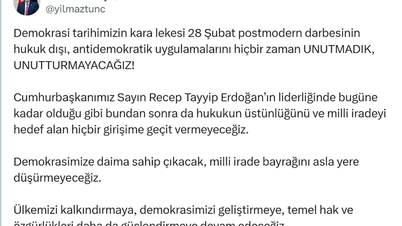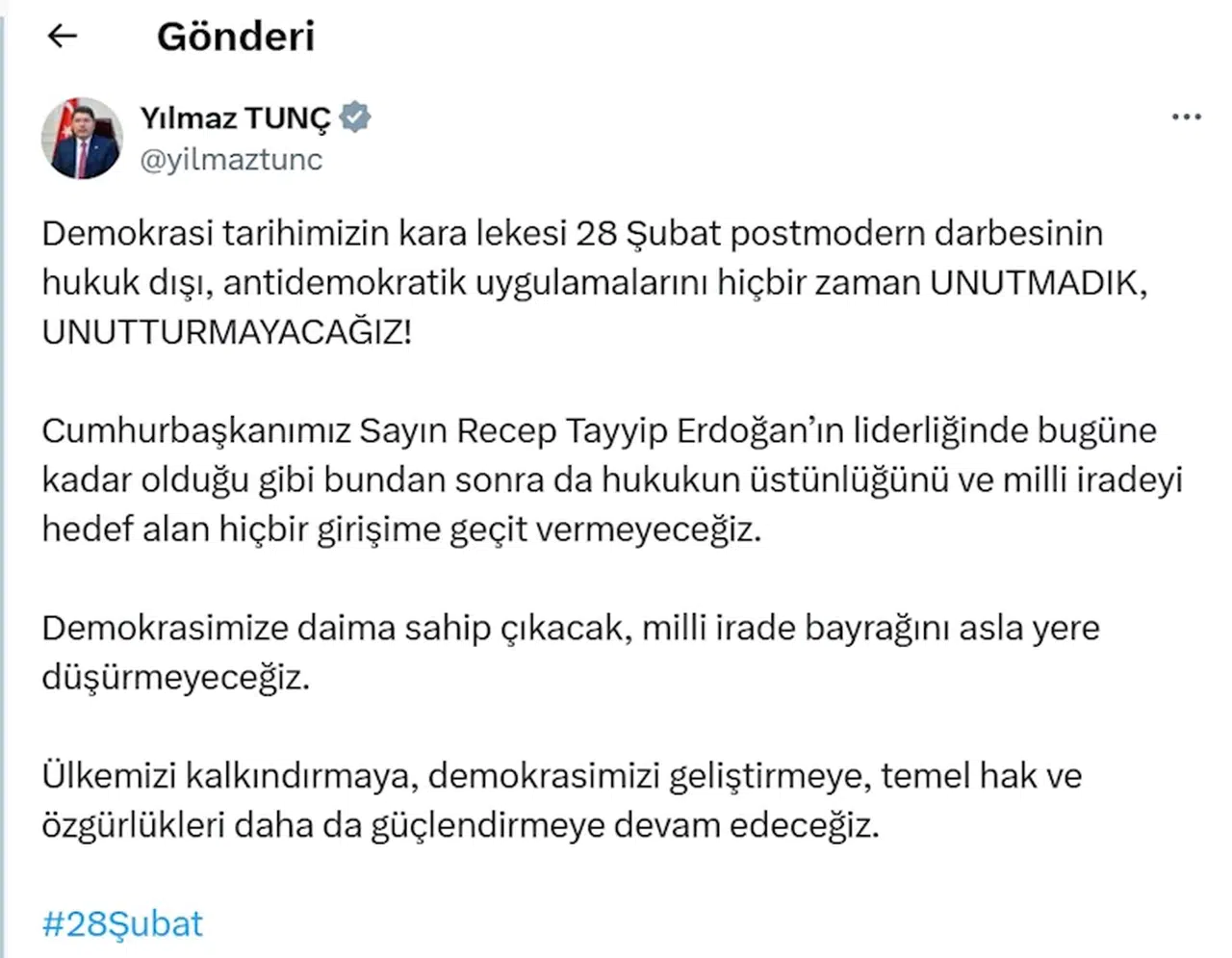 Adalet Bakanı Yılmaz Tunç, sosyal medya hesabından yaptığı açıklamada, "Demokrasi tarihimizin kara lekesi 28 Şubat post modern darbesinin hukuk dışı, antidemokratik uygulamalarını hiçbir zaman unutmadık, unutturmayacağız. Cumhurbaşkanımız Sayın Recep Tayyip Erdoğan’ın liderliğinde bugüne kadar olduğu gibi bundan sonra da hukukun üstünlüğünü ve milli iradeyi hedef alan hiçbir girişime geçit vermeyeceğiz. Demokrasimize daima sahip çıkacak, milli irade bayrağını asla yere düşürmeyeceğiz. Ülkemizi kalkındırmaya, demokrasimizi geliştirmeye, temel hak ve özgürlükleri daha da güçlendirmeye devam edeceğiz" ifadelerini kullandı. (DHA)