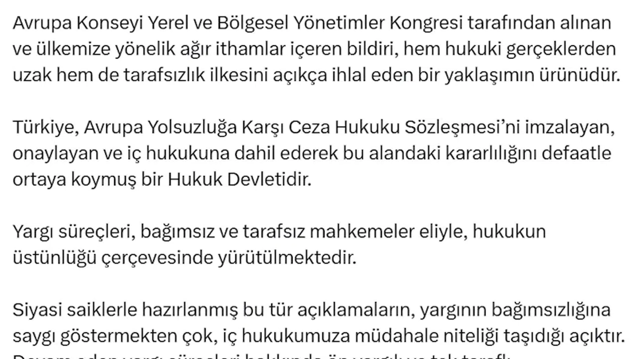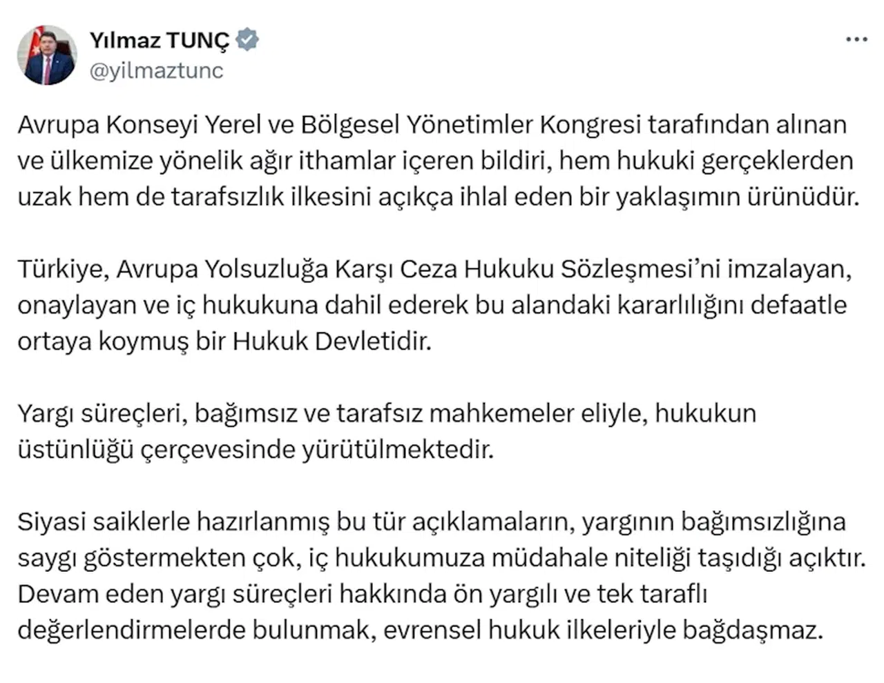 Adalet Bakanı Yılmaz Tunç, sosyal medya hesabından yaptığı açıklamada, İstanbul Cumhuriyet Başsavcılığı'nca düzenlenen soruşturmalara ilişkin acil oturum düzenleyen Avrupa Konseyi Yerel ve Bölgesel Yönetimler Kongresi'nin bildirisine tepki gösterdi. Bakan Tunç, "Avrupa Konseyi Yerel ve Bölgesel Yönetimler Kongresi tarafından alınan ve ülkemize yönelik ağır ithamlar içeren bildiri, hem hukuki gerçeklerden uzak hem de tarafsızlık ilkesini açıkça ihlal eden bir yaklaşımın ürünüdür. Türkiye, Avrupa Yolsuzluğa Karşı Ceza Hukuku Sözleşmesi'ni imzalayan, onaylayan ve iç hukukuna dahil ederek bu alandaki kararlılığını defaatle ortaya koymuş bir hukuk devletidir. Yargı süreçleri, bağımsız ve tarafsız mahkemeler eliyle, hukukun üstünlüğü çerçevesinde yürütülmektedir. Siyasi saiklerle hazırlanmış bu tür açıklamaların, yargının bağımsızlığına saygı göstermekten çok, iç hukukumuza müdahale niteliği taşıdığı açıktır. Devam eden yargı süreçleri hakkında ön yargılı ve tek taraflı değerlendirmelerde bulunmak, evrensel hukuk ilkeleriyle bağdaşmaz" ifadelerini kullandı.