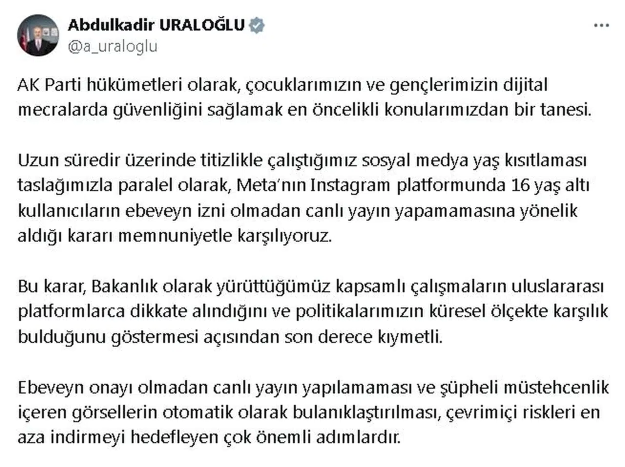 ANKARA, (DHA)- ULAŞTIRMA ve Altyapı Bakanı Abdulkadir Uraloğlu, "Uzun süredir üzerinde titizlikle çalıştığımız sosyal medya yaş kısıtlaması taslağımızla paralel olarak, Meta'nın Instagram platformunda 16 yaş altı kullanıcıların ebeveyn izni olmadan canlı yayın yapamamasına yönelik aldığı kararı memnuniyetle karşılıyoruz" dedi.