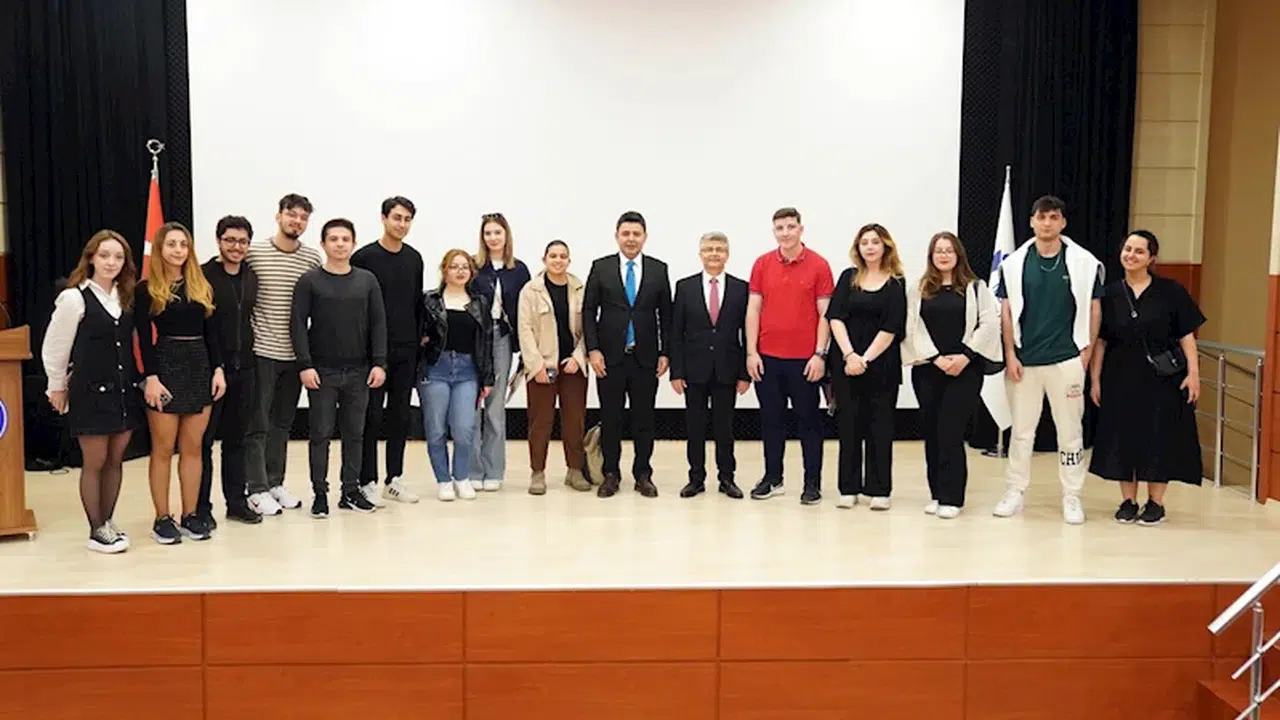 Boyraz, katılımcılardan gelen soruları yanıtladı. EÜ Rektör Yardımcısı Prof. Dr. Mehmet Ersan, Boyraz'a EÜ'nün 70. Kuruluş Yılı'na özel basılan anı pulunu hediye etti. (DHA)