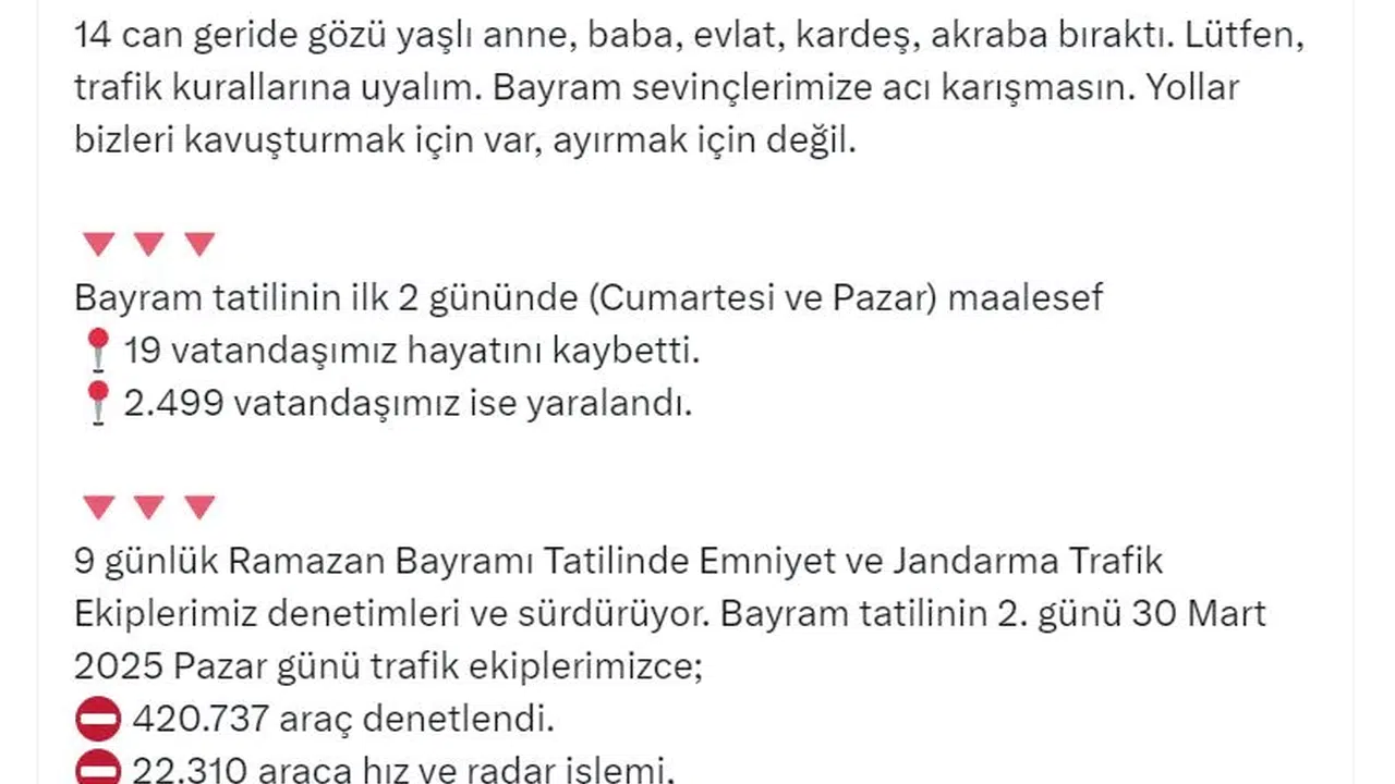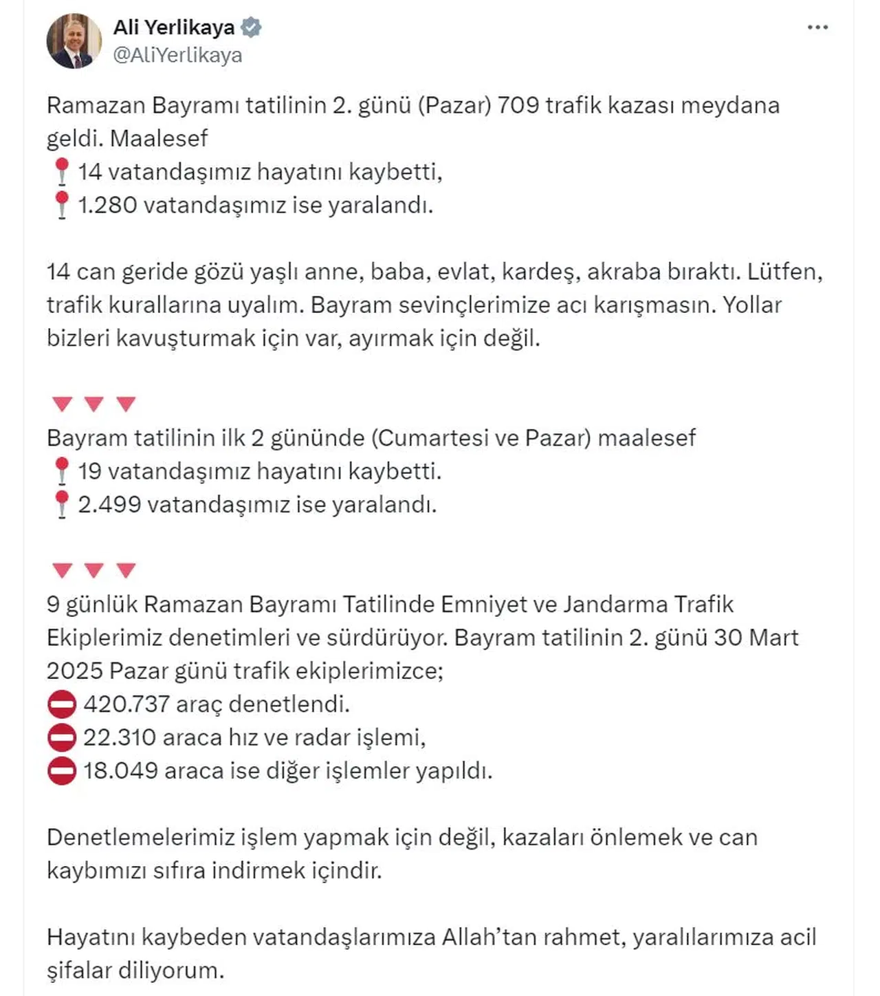 Bakan Yerlikaya, sosyal medya hesabından yaptığı açıklamada, "Ramazan Bayramı tatilinin 2'nci günü (Pazar) 709 trafik kazası meydana geldi. Maalesef 14 vatandaşımız hayatını kaybetti, 1280 vatandaşımız ise yaralandı. 14 can geride gözü yaşlı anne, baba, evlat, kardeş, akraba bıraktı. Lütfen, trafik kurallarına uyalım. Bayram sevinçlerimize acı karışmasın. Yollar bizleri kavuşturmak için var, ayırmak için değil. Bayram tatilinin ilk 2 gününde (Cumartesi ve Pazar) maalesef 19 vatandaşımız hayatını kaybetti. 2 bin 499 vatandaşımız ise yaralandı" dedi.