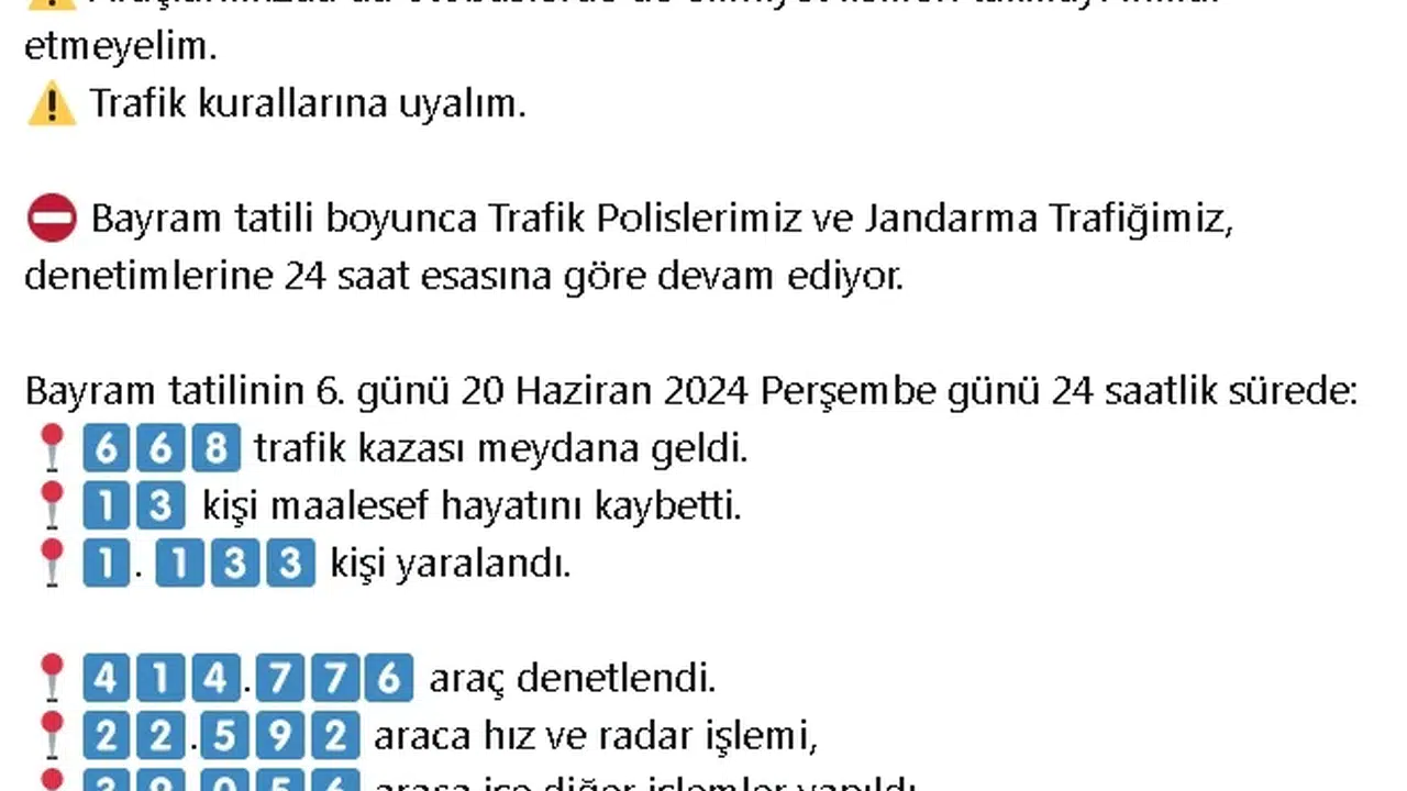 Bakan Ali Yerlikaya, sosyal medya hesabından yaptığı açıklamada, "Bayram tatili için memleketimizin çeşitli illerine giden vatandaşlarımızın geri dönüş yolculukları başladı. Trafik yoğunluğu tekrar artıyor. Lütfen aşırı hız yapmayalım. Araçlarımızda da otobüslerde de emniyet kemeri takmayı ihmal etmeyelim. Trafik kurallarına uyalım. Bayram tatili boyunca trafik polislerimiz ve jandarma trafiğimiz, denetimlerine 24 saat esasına göre devam ediyor. Bayram tatilinin 6'ncı günü, 20 Haziran 2024 Perşembe günü 24 saatlik sürede; 668 trafik kazası meydana geldi. 13 kişi maalesef hayatını kaybetti. 1133 kişi yaralandı. 414 bin 776 araç denetlendi. 22 bin 592 araca hız ve radar işlemi, 39 bin 56 araca ise diğer işlemler yapıldı" ifadelerini kullandı.