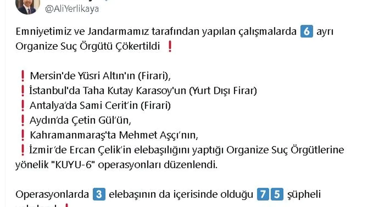 Bakan Ali Yerlikaya, sosyal medya hesabından yaptığı açıklamada, Emniyet Genel Müdürlüğü ve Jandarma Genel Komutanlığı koordinasyonunda Mersin'de Yüsri Altın (Firari), İstanbul'da Taha Kutay Karasoy (Yurt dışı firar), Antalya'da Sami Cerit (Firari), Aydın'da Çetin Gül, Kahramanmaraş'ta Mehmet Aşçı ve İzmir'de Ercan Çelik'in elebaşılığını yaptığı organize suç örgütlerinin 'Kuyu-6' operasyonlarıyla çökertildiğini belirtti. Buna göre; Mersin Emniyet Müdürlüğü Tarsus Kaçakçılık ve Organize Suçlarla Mücadele (KOM) Büro Amirliği tarafından 'Örgüt kurmak', 'Tefecilik', 'Tehdit' ve 'Kasten yaralama' suçlarını işledikleri tespit edilen 10 şüpheli yakalandı, 5'i tutuklandı, 5'i hakkında adli kontrol kararı verildi.