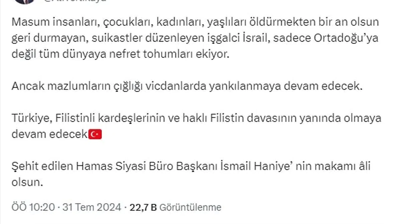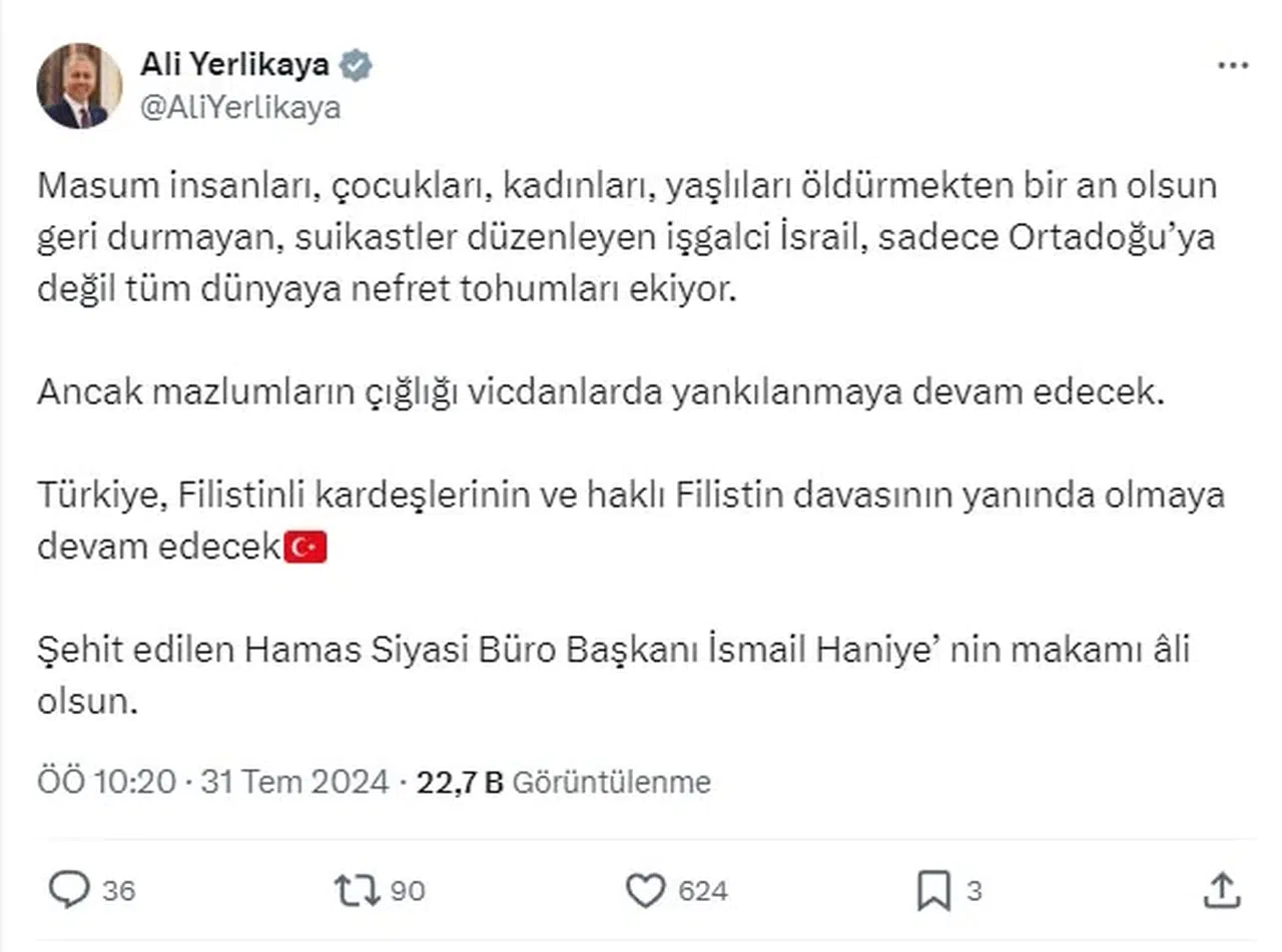 Bakan Yerlikaya, sosyal medya hesabından yaptığı açıklamada, "Siyonistler Tahran’da hain bir suikast düzenledi ve Hamas Siyasi Büro Başkanı İsmail Haniye’yi şehit etti. Bu alçakça suikastı lanetliyorum. Filistin davası bu tür hain suikastlerle bitirilemeyecek kadar kutsal bir davadır ve güçlenerek devam edecektir. Masum insanları, çocukları, kadınları, yaşlıları öldürmekten bir an olsun geri durmayan, suikastler düzenleyen işgalci İsrail, sadece Ortadoğu’ya değil tüm dünyaya nefret tohumları ekiyor. Ancak mazlumların çığlığı vicdanlarda yankılanmaya devam edecek. Türkiye, Filistinli kardeşlerinin ve haklı Filistin davasının yanında olmaya devam edecek. Şehit edilen Hamas Siyasi Büro Başkanı İsmail Haniye’nin makamı ali olsun. Haniye’ye Allah’tan rahmet, mazlum Filistin halkına başsağlığı diliyorum" ifadelerini kullandı. (DHA)