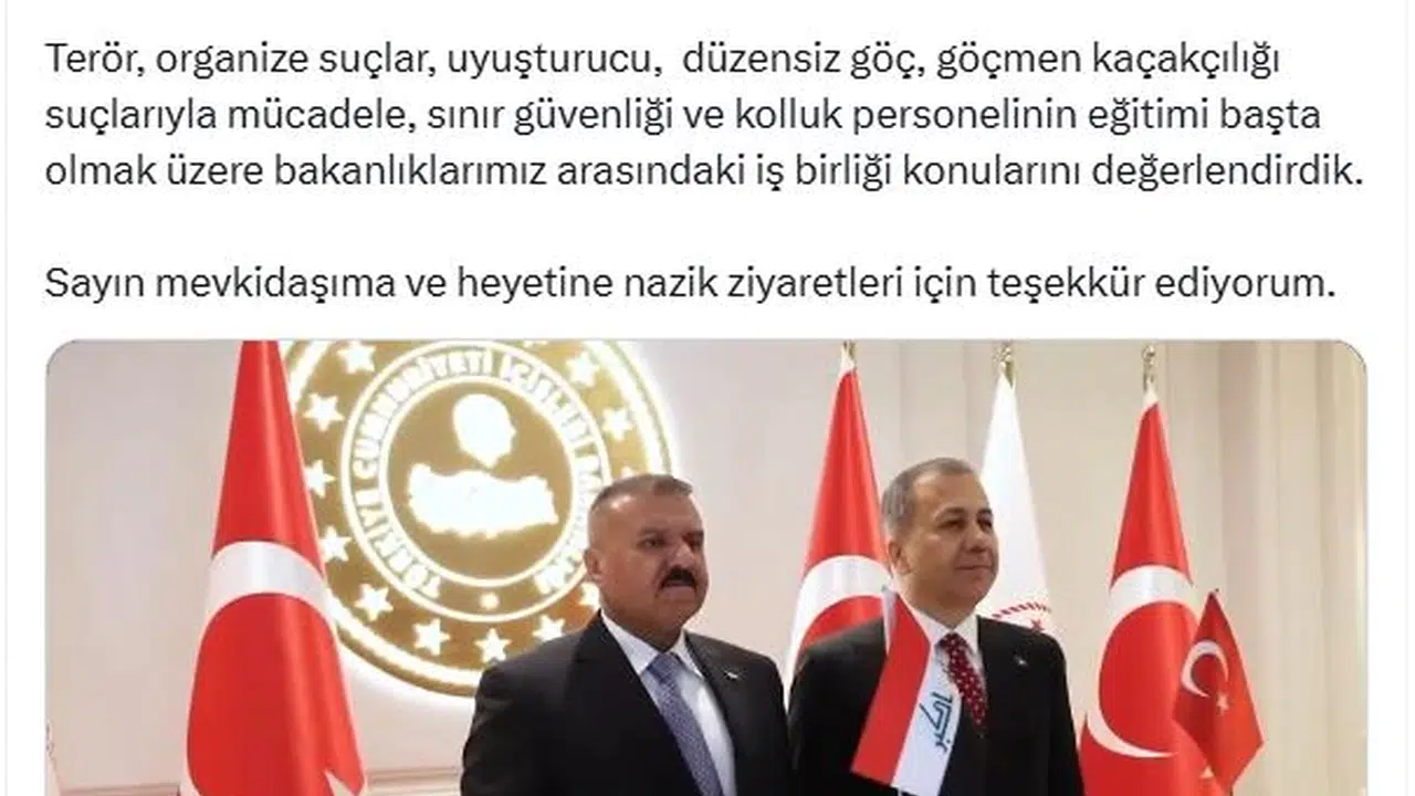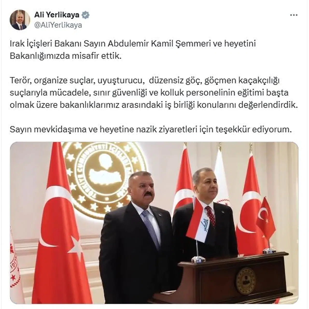 Bakan Ali Yerlikaya, görüşmeye ilişkin sosyal medya hesabından yaptığı açıklamada, "Irak İçişleri Bakanı Sayın Abdulemir Kamil Şemmeri ve heyetini bakanlığımızda misafir ettik. Terör, organize suçlar, uyuşturucu, düzensiz göç, göçmen kaçakçılığı suçlarıyla mücadele, sınır güvenliği ve kolluk personelinin eğitimi başta olmak üzere bakanlıklarımız arasındaki iş birliği konularını değerlendirdik. Sayın mevkidaşıma ve heyetine nazik ziyaretleri için teşekkür ediyorum" dedi. (DHA)