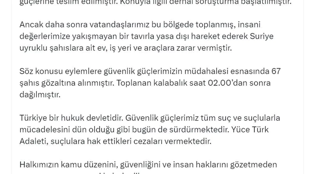 Aliekber METE/ANKARA,(DHA)- İÇİŞLERİ Bakanı Ali Yerlikaya, Kayseri'nin Melikgazi ilçesinde Suriye uyruklu bir kişinin 7 yaşındaki çocuğu taciz ettiği iddialarının ardından yaşanan olaylara ilişkin, "Konuyla ilgili derhal soruşturma başlatılmıştır. Ancak daha sonra vatandaşlarımız bu bölgede toplanmış, insani değerlerimize yakışmayan bir tavırla yasa dışı hareket ederek Suriye uyruklu şahıslara ait ev, iş yeri ve araçlara zarar vermiştir. Söz konusu eylemlere güvenlik güçlerimizin müdahalesi esnasında 67 şahıs gözaltına alınmıştır" dedi.