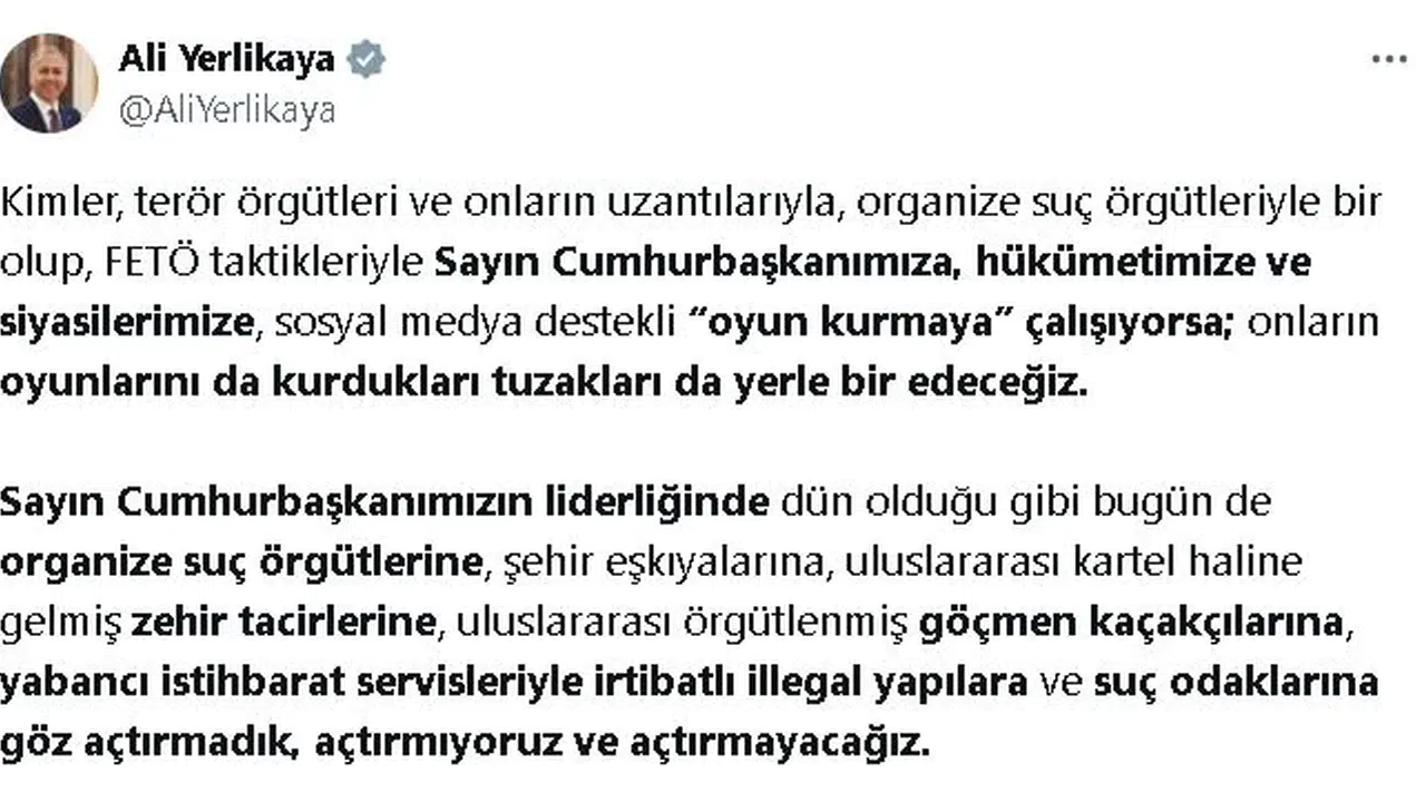 Bakan Yerlikaya, sosyal medya hesabından 'Ayhan Bora Kaplan' suç örgütüne yönelik soruşturma kapsamındaki 'kumpas' iddialarına ilişkin sosyal medya hesabından yaptığı açıklamada, "Kimler, terör örgütleri ve onların uzantılarıyla, organize suç örgütleriyle bir olup, FETÖ taktikleriyle Sayın Cumhurbaşkanımıza, hükümetimize ve siyasilerimize, sosyal medya destekli "oyun kurmaya" çalışıyorsa; onların oyunlarını da kurdukları tuzakları da yerle bir edeceğiz. Sayın Cumhurbaşkanımızın liderliğinde dün olduğu gibi bugün de organize suç örgütlerine, şehir eşkıyalarına, uluslararası kartel haline gelmiş zehir tacirlerine, uluslararası örgütlenmiş göçmen kaçakçılarına, yabancı istihbarat servisleriyle irtibatlı illegal yapılara ve suç odaklarına göz açtırmadık, açtırmıyoruz ve açtırmayacağız. Bu mücadelemizi kimler engellemeye çalışıyorsa, kimler FETÖ'vari gizli tanık taktikleriyle kendi karanlık düzenlerinin hakim olmasını istiyorsa, onların o düzenlerini de başlarına yıkıyoruz, yıkmaya da devam edeceğiz" dedi.