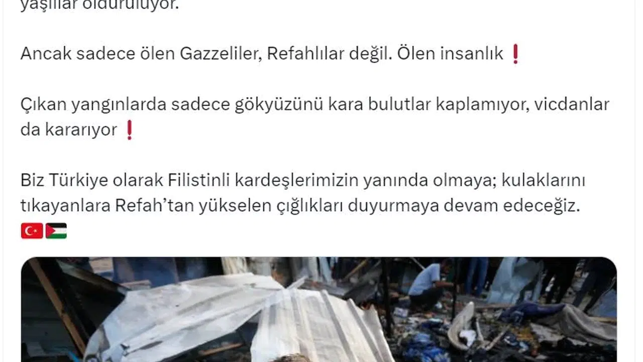 ANKARA, (DHA)- İÇİŞLERİ Bakanı Ali Yerlikaya, İsrail'in, Refah kentindeki Filistin kampını bombalamasına ilişkin, "Biz Türkiye olarak Filistinli kardeşlerimizin yanında olmaya; kulaklarını tıkayanlara Refah'tan yükselen çığlıkları duyurmaya devam edeceğiz" dedi.