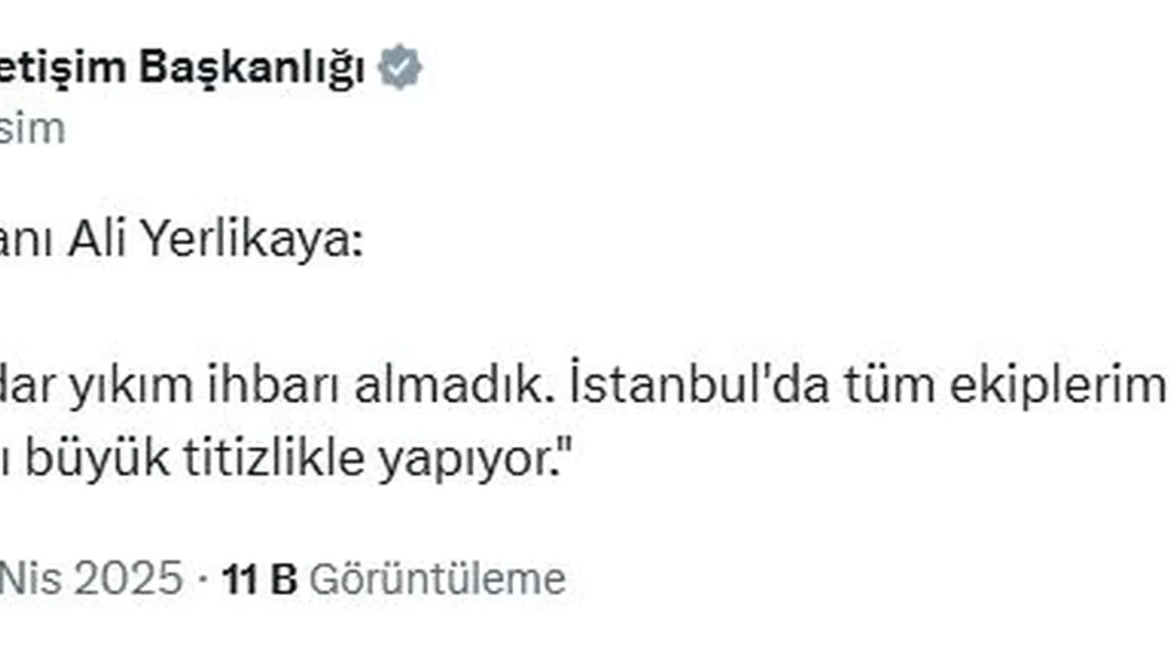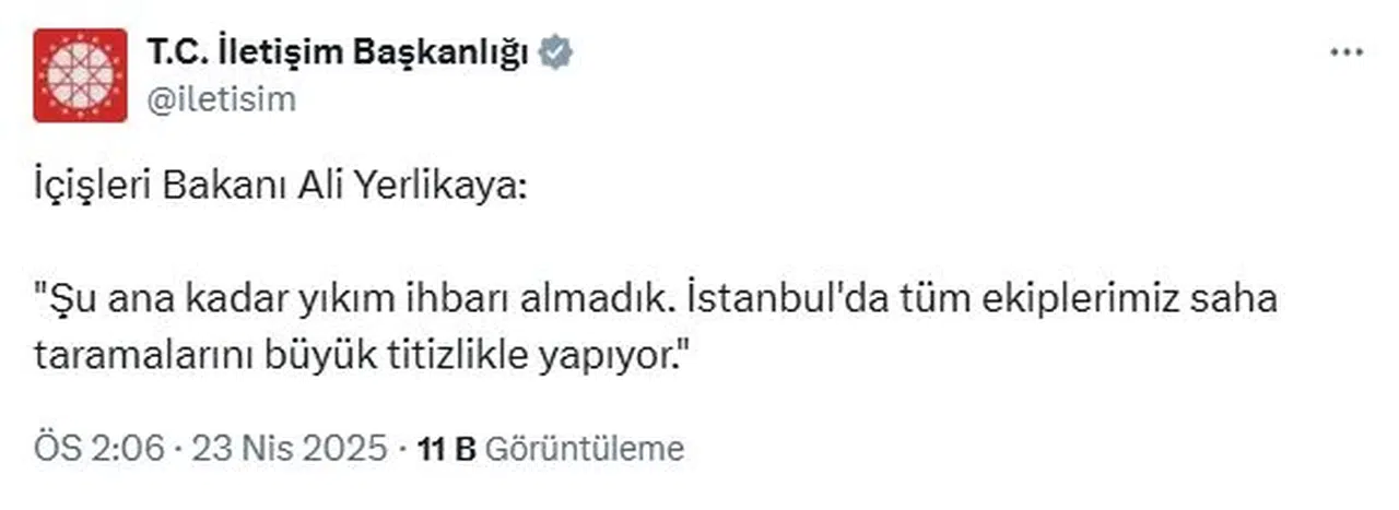 ANKARA, (DHA)- İÇİŞLERİ Bakanı Ali Yerlikaya, İstanbul'daki 6.2 büyüklüğündeki depreme ilişkin şu ana kadar yıkım ihbarı alınmadığını açıkladı.