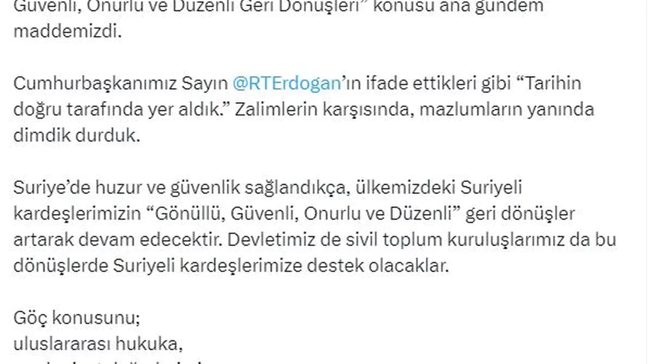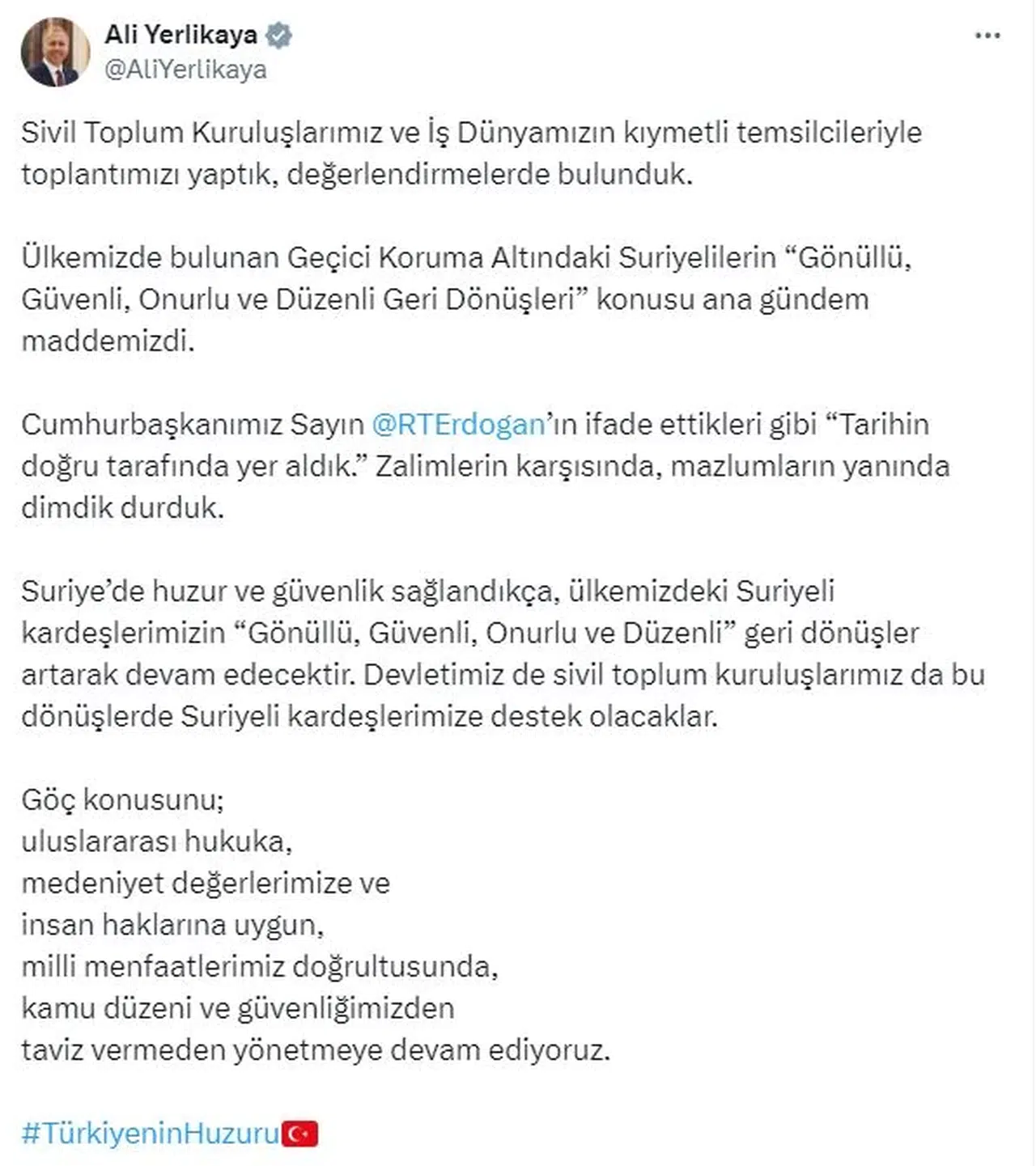 ANKARA, (DHA)- İÇİŞLERİ Bakanı Ali Yerlikaya, "Suriye'de huzur ve güvenlik sağlandıkça, ülkemizdeki Suriyeli kardeşlerimizin gönüllü, güvenli, onurlu ve düzenli geri dönüşleri artarak devam edecektir" dedi.