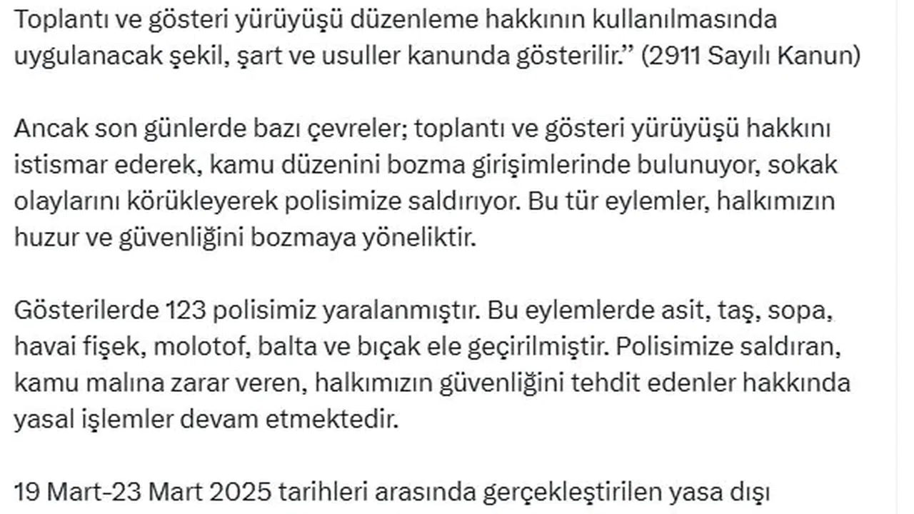Yerlikaya, son günlerde bazı çevrelerin toplantı ve gösteri yürüyüşü hakkını istismar ederek, kamu düzenini bozma girişimlerinde bulunduğunu, sokak olaylarını körükleyerek polise saldırdığına, bu tür eylemlerin halkın huzur ve güvenliğini bozmaya yönelik olduğunu vurguladı. Yerlikaya, "Gösterilerde 123 polisimiz yaralanmıştır. Bu eylemlerde asit, taş, sopa, havai fişek, molotof, balta ve bıçak ele geçirilmiştir. Polisimize saldıran, kamu malına zarar veren, halkımızın güvenliğini tehdit edenler hakkında yasal işlemler devam etmektedir. 19 Mart-23 Mart 2025 tarihleri arasında gerçekleştirilen yasa dışı eylemlerde 1133 şüpheli gözaltına alınmıştır. Yakalananlar arasında 12 farklı terör örgütüyle iltisaklı olan şahıslar belirlenmiştir. Ayrıca gözaltına alınan şahısların, aralarında ‘Uyuşturucu’, 'Hırsızlık’, ‘Dolandırıcılık’, ‘Cinsel taciz/istismar’, ‘Kasten yaralama’ gibi suçların da bulunduğu 17 farklı suçtan adli işlem gördükleri tespit edilmiştir. Buradan açıkça uyarıyoruz; Gençlerimizi, halkımızı kimse kendi siyasi emellerine kalkan yapmaya kalkmasın. Bunun vebalini sadece siyasi değil, hukuki olarak da kimse ödeyemez. Huzur ve güvenliğin tesisi için her zaman olduğu gibi görevimizin başındayız. Sokaklarımızın terörize edilmesine, milletimizin huzur ve güvenliğinin tehdit edilmesine kesinlikle müsamaha gösterilmeyecektir. Vatandaşlarımızı, bu tür provokasyonlara karşı dikkatli olmaya ve sağduyulu hareket etmeye davet ediyoruz" ifadelerini kullandı. (DHA)