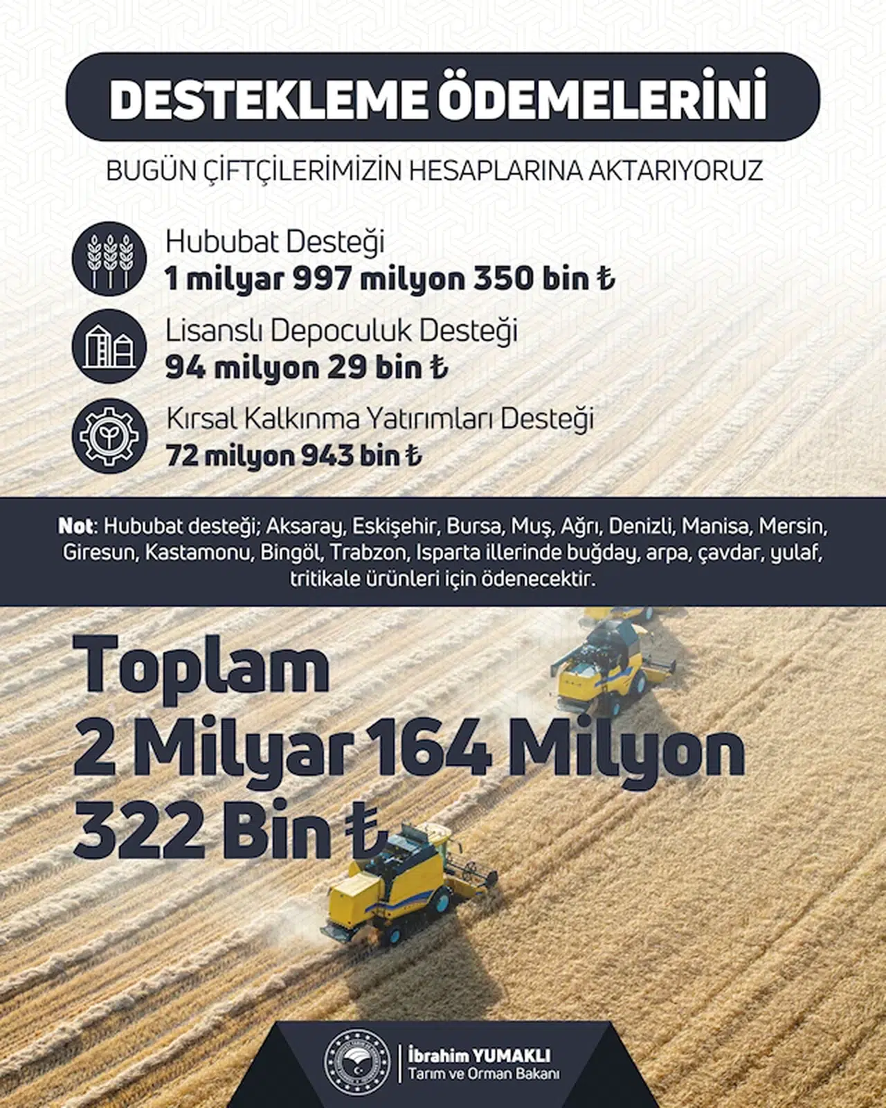 Tarım ve Orman Bakanı İbrahim Yumaklı, sosyal medya hesabından yaptığı açıklamada, 1 milyar 997 milyon 350 bin TL Hububat Desteği, 94 milyon 29 bin TL Lisanslı Depoculuk Desteği ve 72 milyon 943 bin TL Kırsal Kalkınma Yatırımları Desteği olmak üzere toplam 2 milyar 164 milyon 322 bin TL tarımsal destekleme ödemesinin bugün çiftçilerin hesaplarına aktardıklarını belirtti. Bakan Yumaklı, Hububat Desteği'nin; Aksaray, Eskişehir, Bursa, Muş, Ağrı, Denizli, Manisa, Mersin, Giresun, Kastamonu, Bingöl, Trabzon, Isparta illerinde buğday, arpa, çavdar, yulaf, tritikale ürünleri için ödeneceğini açıkladı. (DHA)