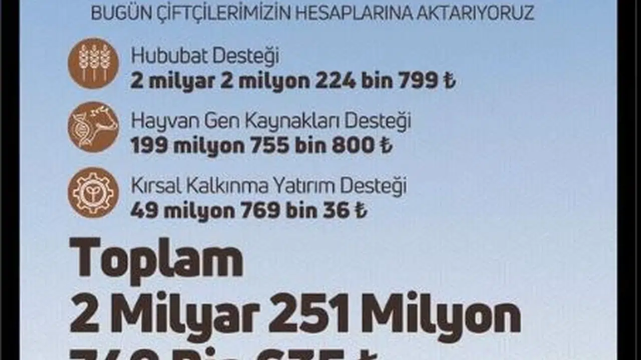 Gizem CENGİL/ANKARA, (DHA)- TARIM ve Orman Bakanı İbrahim Yumaklı, 2 milyar 251 milyon 749 bin TL tarımsal destekleme ödemesinin çiftçilerin hesaplarına aktarıldığını açıkladı.