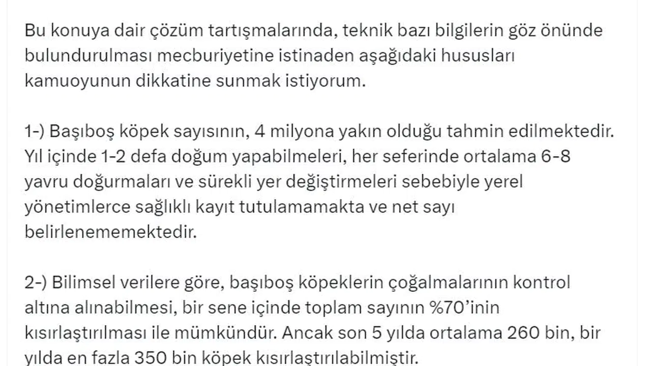 Bakan Yumaklı, sosyal medya hesabından yaptığı açıklamada, başıboş sokak köpekleri sorununun temelinde, bu hayvanların sorumluluklarını yasal olarak üstlenen sahip bir kişi veya kurumun olmaması yattığını söyledi. Bu konuya dair çözüm tartışmalarında, teknik bazı bilgilerin göz önünde bulundurulması mecburiyeti olduğunu dikkat çekerek, "Başıboş köpek sayısının, 4 milyona yakın olduğu tahmin edilmektedir. Yıl içinde 1-2 defa doğum yapabilmeleri, her seferinde ortalama 6-8 yavru doğurmaları ve sürekli yer değiştirmeleri sebebiyle yerel yönetimlerce sağlıklı kayıt tutulamamakta ve net sayı belirlenememektedir. Bilimsel verilere göre, başıboş köpeklerin çoğalmalarının kontrol altına alınabilmesi, bir sene içinde toplam sayının yüzde 70'inin kısırlaştırılması ile mümkündür. Ancak son 5 yılda ortalama 260 bin, bir yılda en fazla 350 bin köpek kısırlaştırılabilmiştir" dedi.