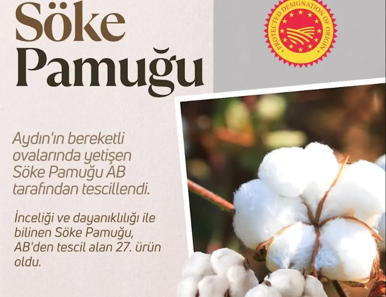 ANKARA, (DHA)- TARIM ve Orman Bakanı İbrahim Yumaklı, Aydın Söke pamuğunun Avrupa Birliği (AB) coğrafi işaret tescili aldığını açıkladı.