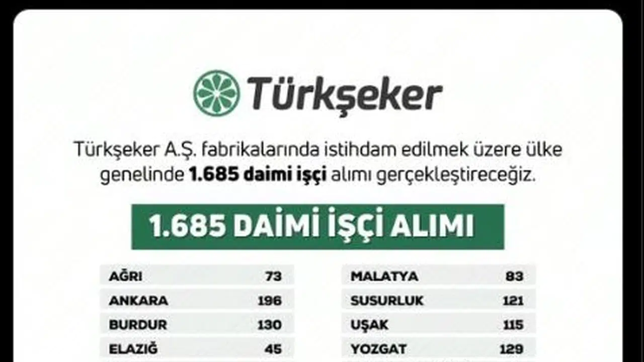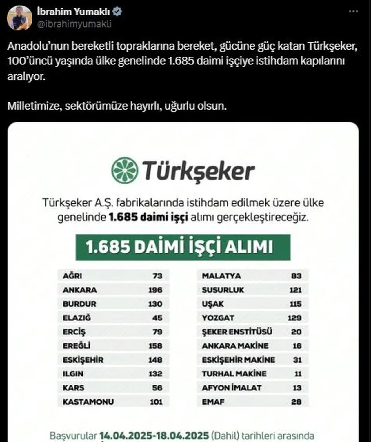 Bakan Yumaklı, sosyal medya hesabından yaptığı açıklamada, "Anadolu'nun bereketli topraklarına bereket, gücüne güç katan Türkşeker, 100'üncü yaşında ülke genelinde 1685 daimi işçiye istihdam kapılarını aralıyor. Milletimize, sektörümüze hayırlı, uğurlu olsun" ifadelerini kullandı.