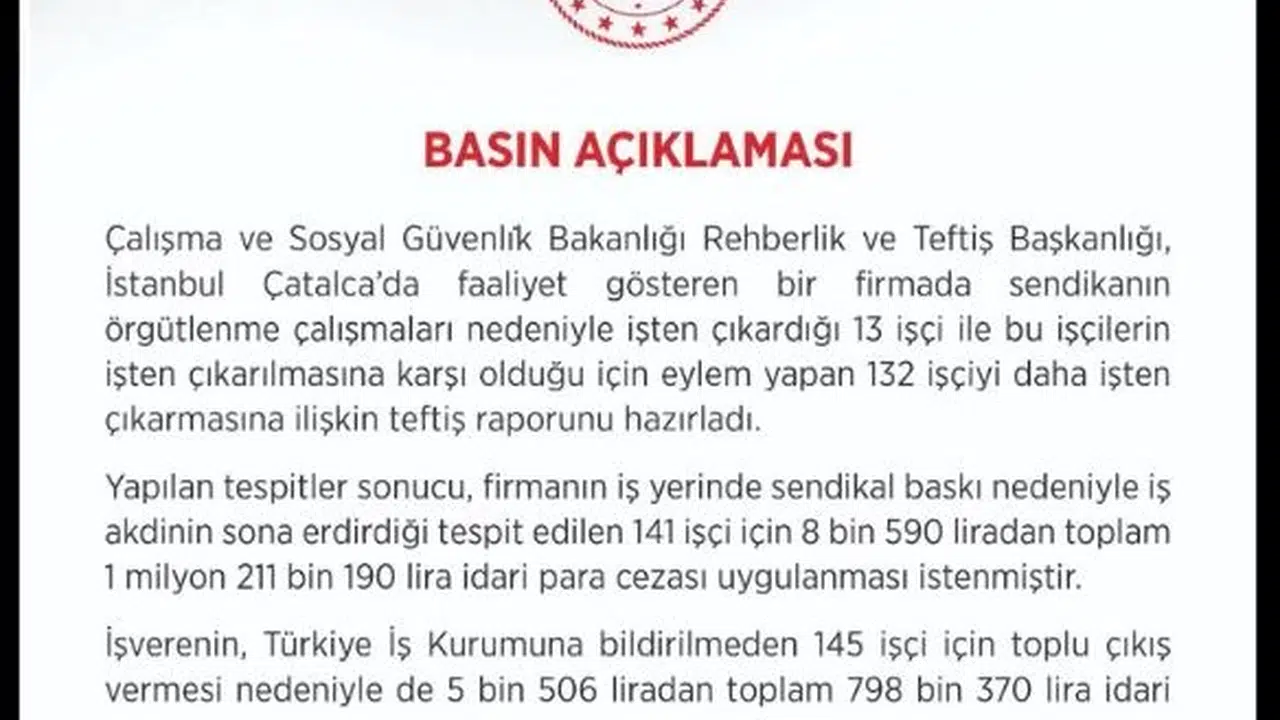 Bakanlıktan yapılan yazılı açıklamada, İstanbul Çatalca'da faaliyet gösteren bir firmada sendikanın örgütlenme çalışmaları nedeniyle 13 kişinin işten çıkarıldığını ve ardından bu işçilerin işten çıkarılmasına karşı eylem yapan 132 işçinin daha işten çıkarıldığını hatırlattı. Konuyla ilgili Çalışma ve Sosyal Güvenlik Bakanlığı Rehberlik ve Teftiş Başkanlığı tarafından teftiş raporunun hazırlandığı belirtilerek, "Yapılan tespitler sonucu, firmanın iş yerinde sendikal baskı nedeniyle iş akdinin sona erdirdiği tespit edilen 141 işçi için 8 bin 590 liradan toplam 1 milyon 211 bin 190 lira idari para cezası uygulanması istenmiştir. İşverenin, Türkiye İş Kurumuna bildirilmeden 145 işçi için toplu çıkış vermesi nedeniyle de 5 bin 506 liradan toplam 798 bin 370 lira idari para cezası vermesi istenmiştir. Ayrıca, sendika üyesi işçileri işten çıkarmak suretiyle işyerinde hukuka aykırı olarak sendikal faaliyetleri engelleyen işveren hakkında Cumhuriyet Başsavcılığına suç duyurusunda bulunulmuştur. Emeğin, sendikal örgütlenmenin ve çalışanların hak ve özgürlüklerinin korunması için bakanlık olarak üzerimize düşen sorumlulukları yerine getirmeye devam ediyoruz" denildi. (DHA)