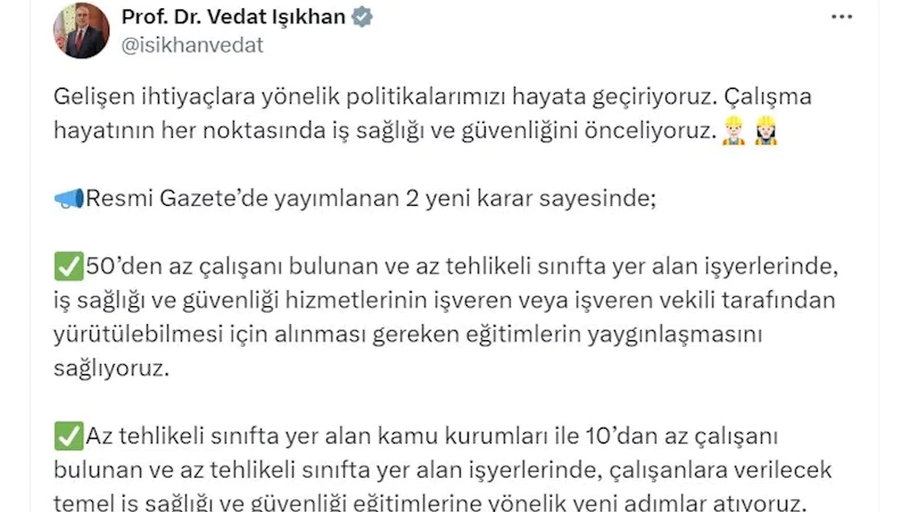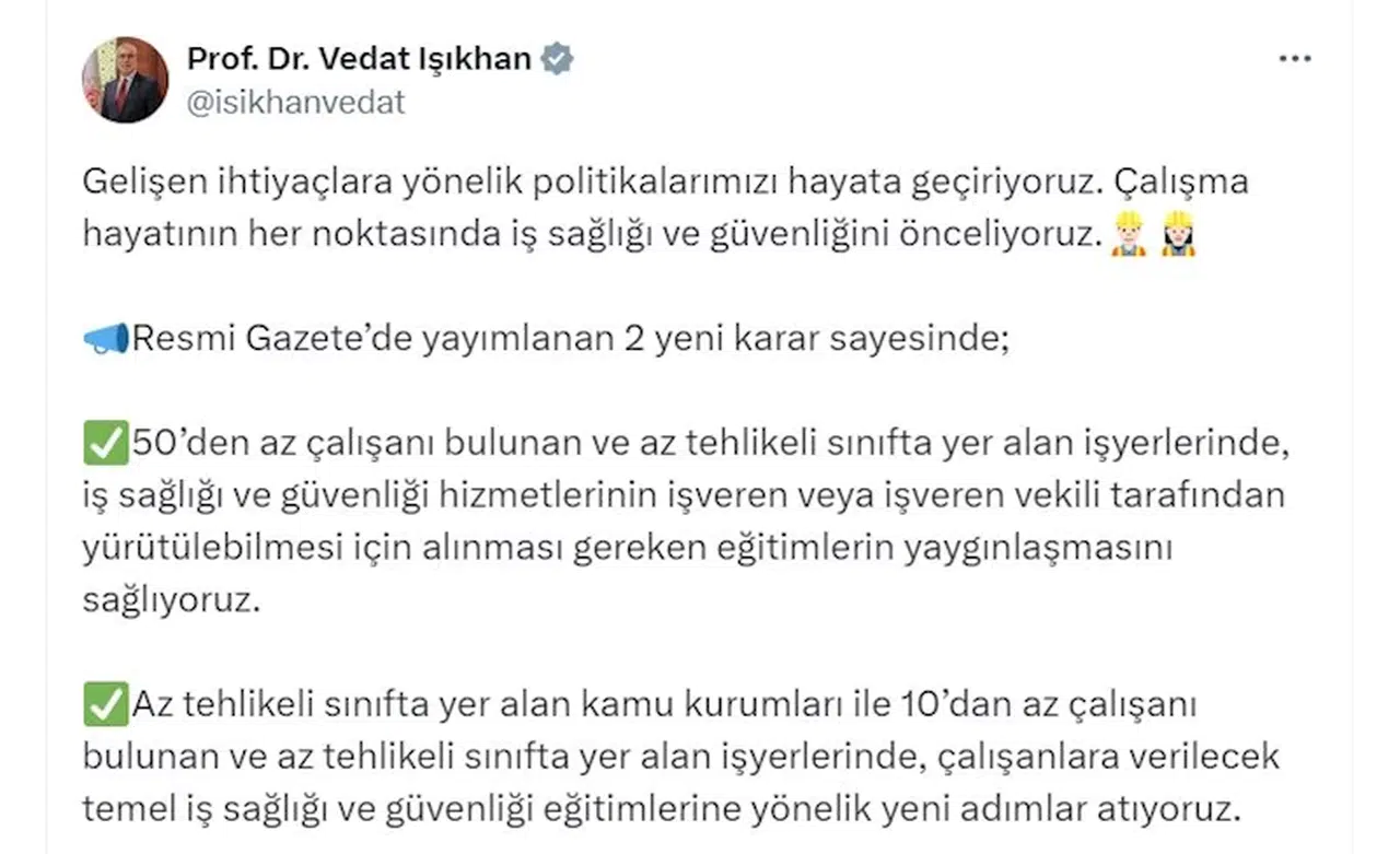 ANKARA, (DHA)- ÇALIŞMA ve Sosyal Güvenlik Bakanı Vedat Işıkhan, iş sağlığı ve güvenliğine yönelik 2 yeni düzenlemenin Resmi Gazete'de yayımlandığını duyurdu.