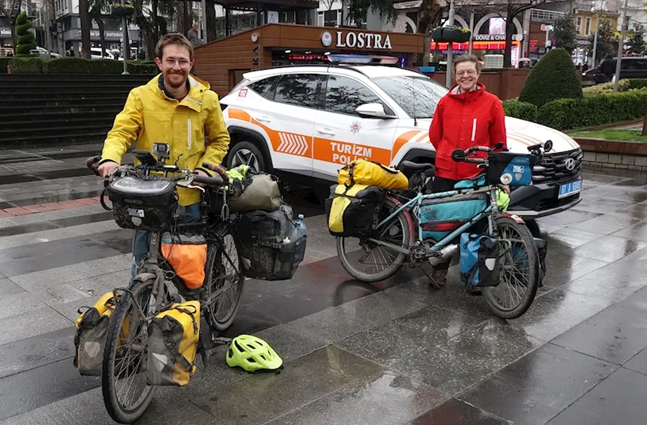 Fransa'da geçen yıl temmuz ayında dünyaevine giren Emilie Maury Larıbere (29) ve Matthieu Trupın (29) çifti, bisikletle dünyayı gezmeye karar erdi. Balayı hayalleri olan bisikletli dünya turunu gerçekleştirmek için Paris'ten yola çıkan çift, yolculuklarının 6'ncı ayında yaklaşık 4 bin kilometre pedal çevirip, Trabzon'a ulaştı. Çift, kentte iletişime geçtikleri turizm polisleri tarafından karşılandı. Turizm polislerinin yardımcı olduğu çift, kentte bir otelde konaklayarak vakit geçirdi. Trabzon'daki misafirperverlikle moral depolayan bisikletli çift, yeniden yola koyuldu. Gürcistan üzerinden Uzak Doğu'ya planladıkları rotalarına devam edecek olan çiftin Fransa'dan başlayan yolculukları Gürcistan, Kazakistan, Çin, Güney Kore ve daha sonra Japonya'ya ulaştıklarında sona erecek.