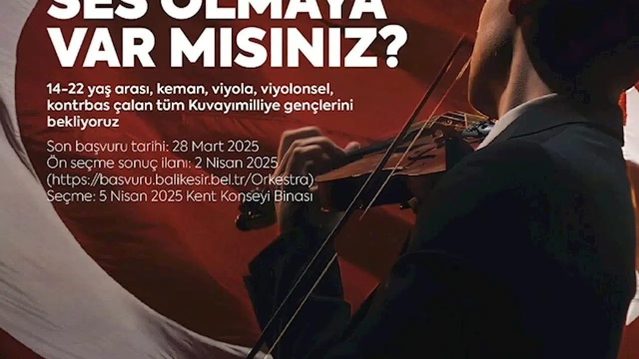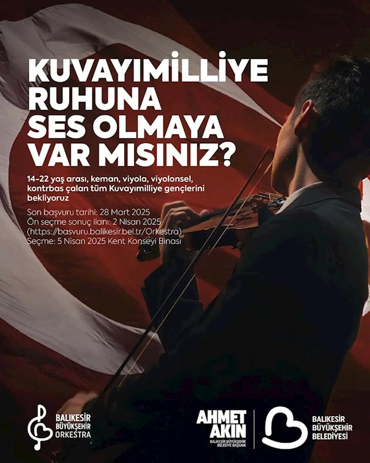 Balıkesir Büyükşehir Belediyesi'nin şehrin kültür-sanat hayatına katkıları sürüyor. Balıkesir Kent Konseyi'nin tavsiye kararıyla Balıkesir Büyükşehir Belediye Orkestrası'nın oluşturacağı Kuva-yı Milliye Gençlik Orkestrası için başvurular başladı. Keman, viyola, viyolonsel ve kontrbas çalan 14-22 yaş arası gençler, 30 kişilik orkestrada yer alabilmek için 28 Mart'a kadar başvuru yapabilecek.